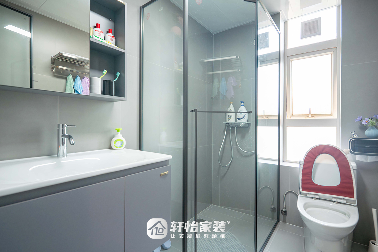 卫生间以统一的浅灰色系瓷砖铺陈,从墙面延伸至地面,形成浑然一体的视觉扩张感,宁静而富有质感。