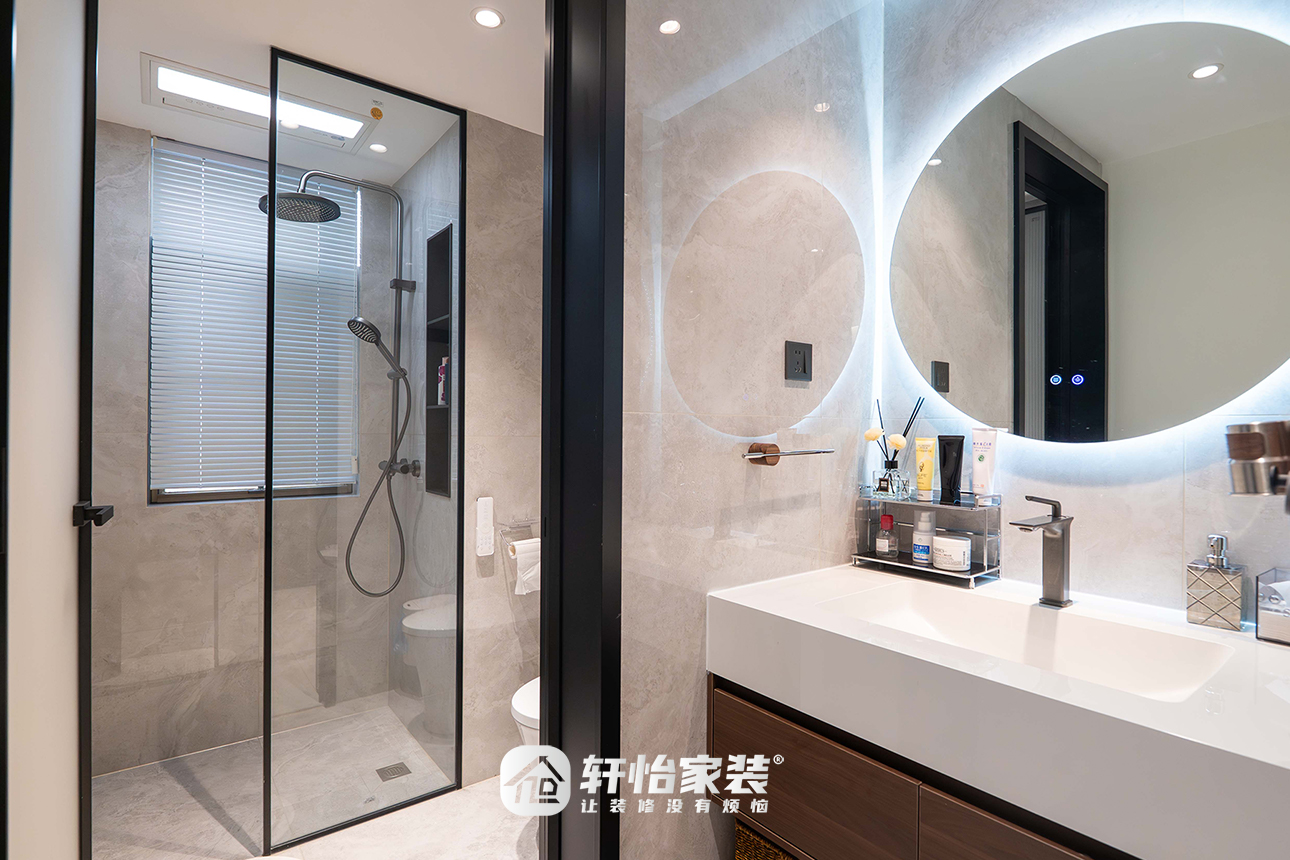 洗手台外置+干湿分离的布局,成就简洁流畅的功能空间。黑色线条在结构内穿行游走,叠加上镜面与灯带,让设计魅力贯穿始终。