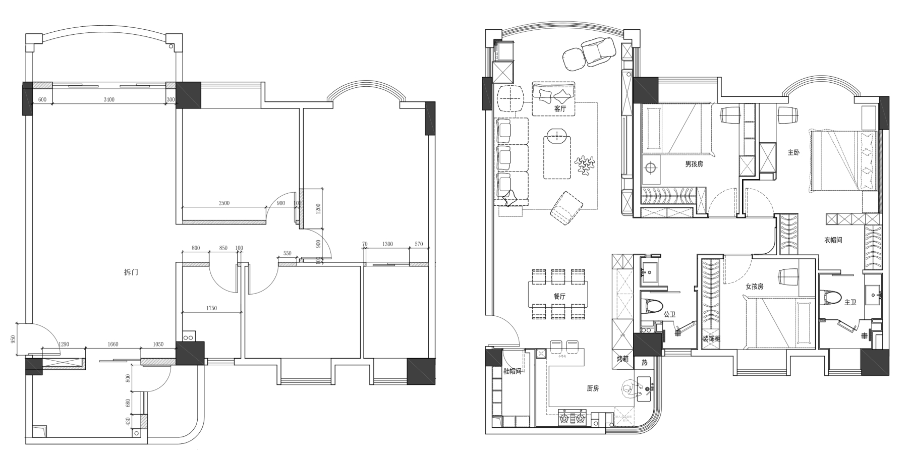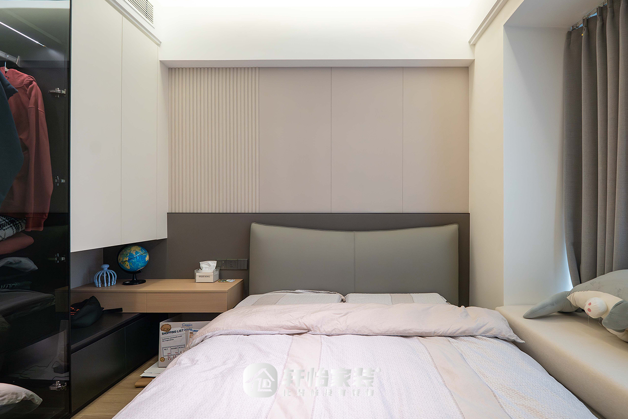 3.男孩房改出折墙做定制柜,为当下生活场景提供便捷,也为门位关系提供了调整空间;