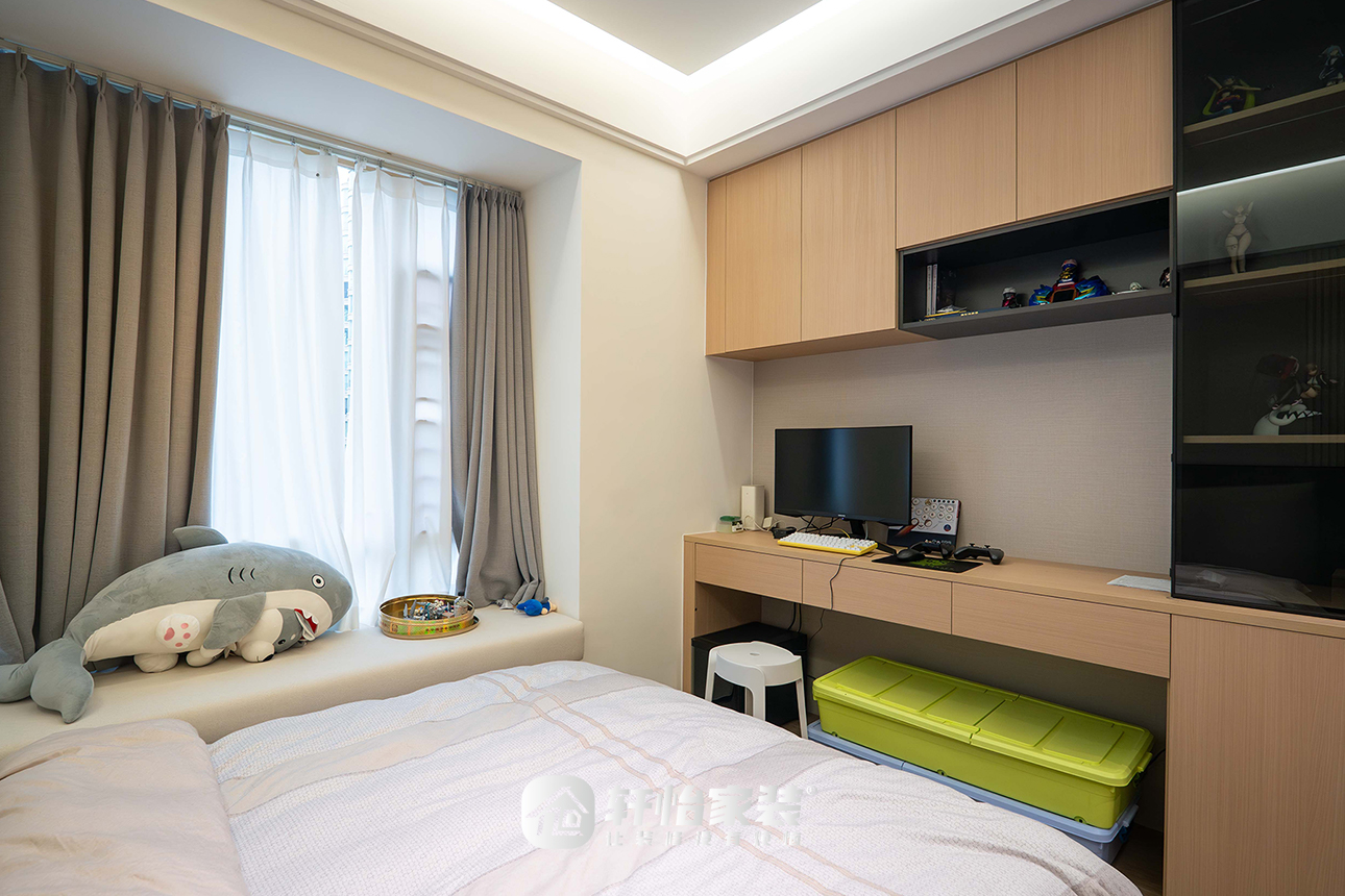 男孩房两处折墙设计是空间的灵魂所在,既为墙面赢得了定制柜体的容量,又保证了内部空间的平整与纯粹。