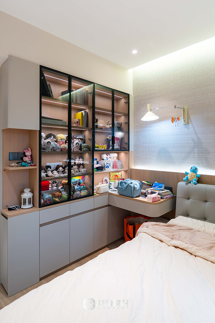 床侧定制柜体巧妙延伸,将开放格、展示柜与小桌台合而为一,无缝链接学习、展示与收纳多种生活场景,诠释出专属于少女的精致与惬意。