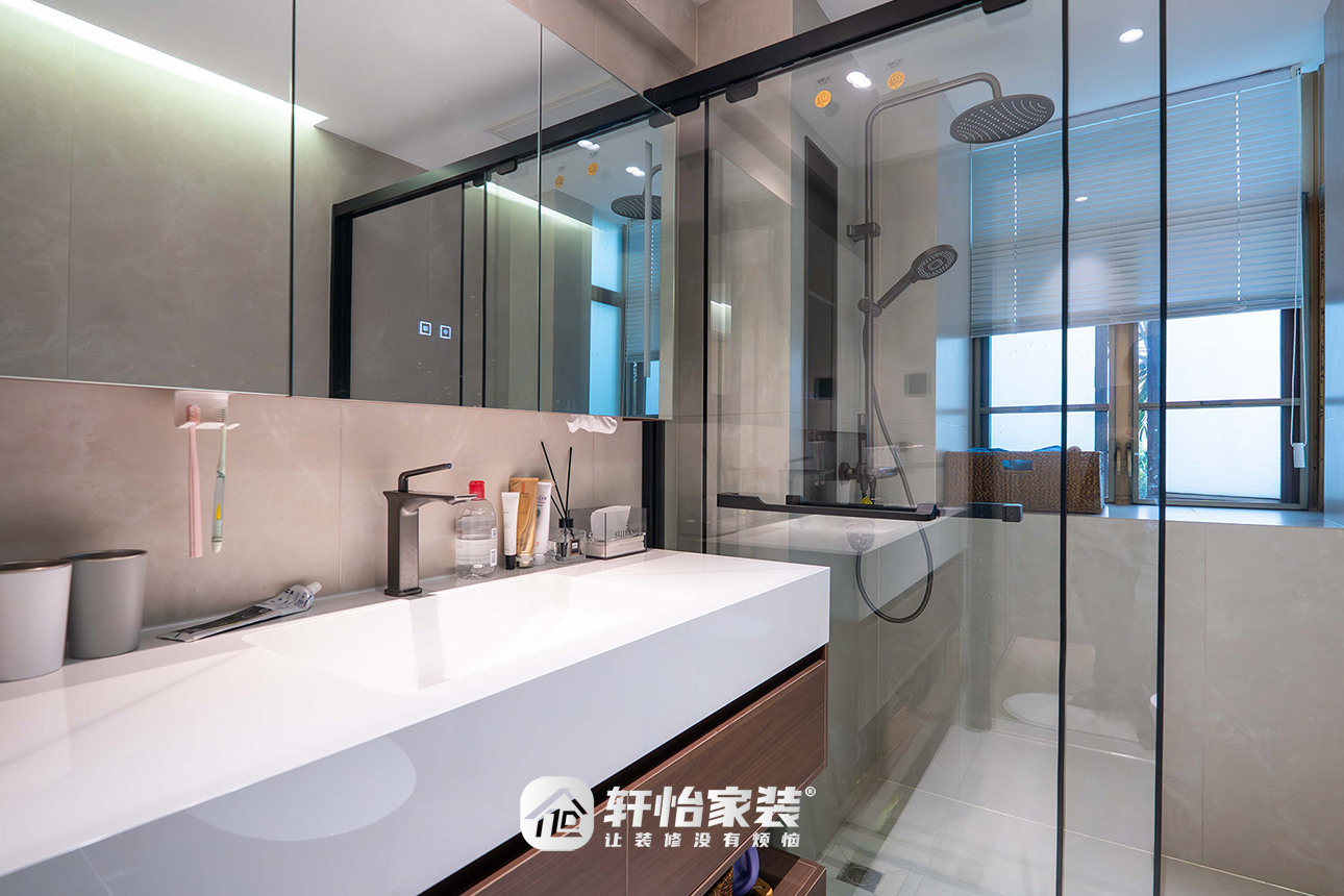 主卫虽经内缩,但采用U型布局化解进深问题,加长镜柜则同时满足收纳与拓展视觉空间的双重需求。
