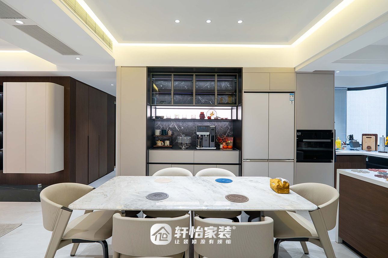 餐厅围绕餐桌打开,餐边柜以多变形式承载日常功能场景,满足生活动态需求。