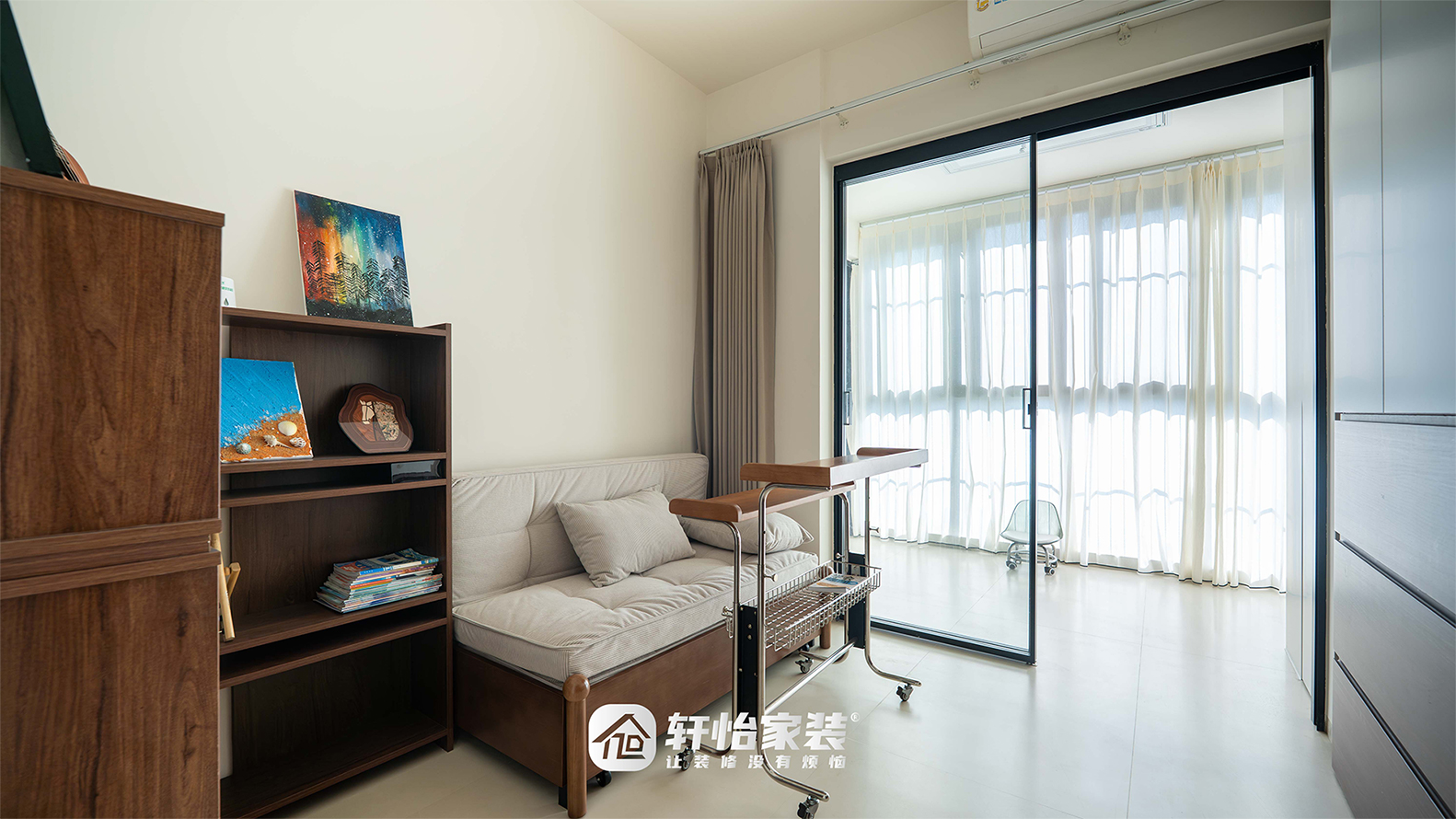 多功能房把“灵活”与“实用”拿捏得恰到好处:L型书架兼顾收纳与展示,书籍与收藏品一目了然;玻璃推拉门引入光线,连通内外视野,小空间也显通透开阔。