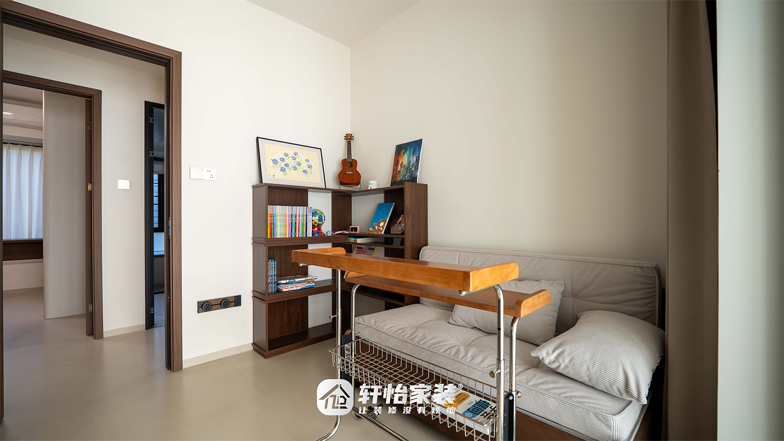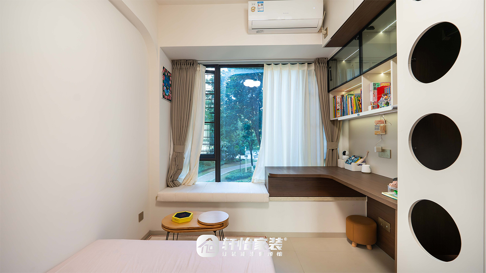 窗台铺软垫,搭配小圆几,成为孩子阅读、玩耍的小天地。拉开窗帘,窗外绿意盎然,是孩子每天温暖的风景。