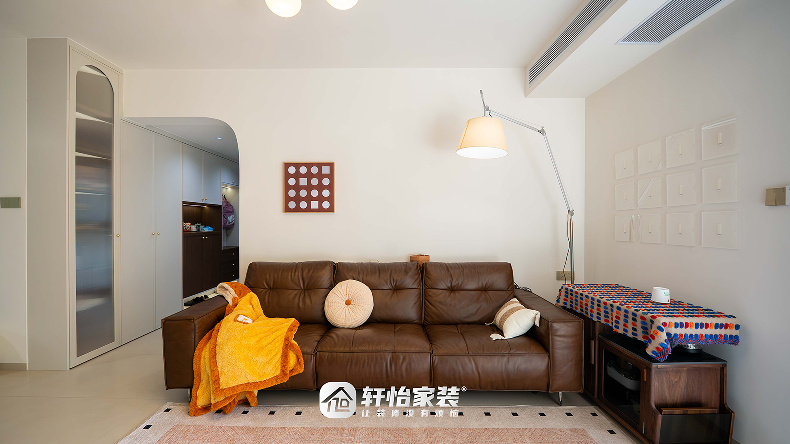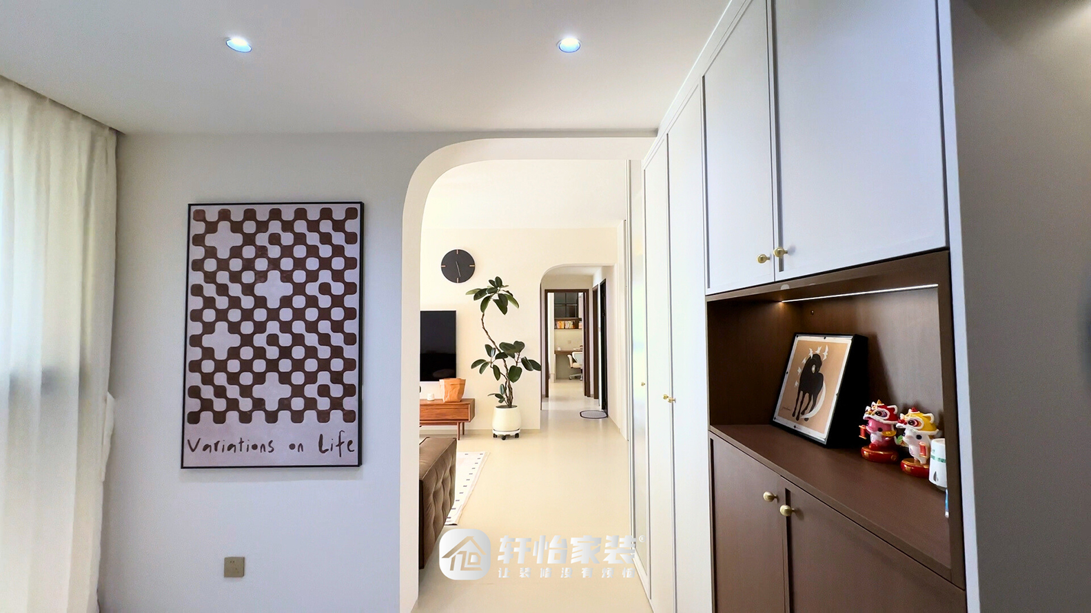 推门而入,一道半拱形隔断以柔和的弧度划分玄关与客厅,视线穿过却不一览无余;