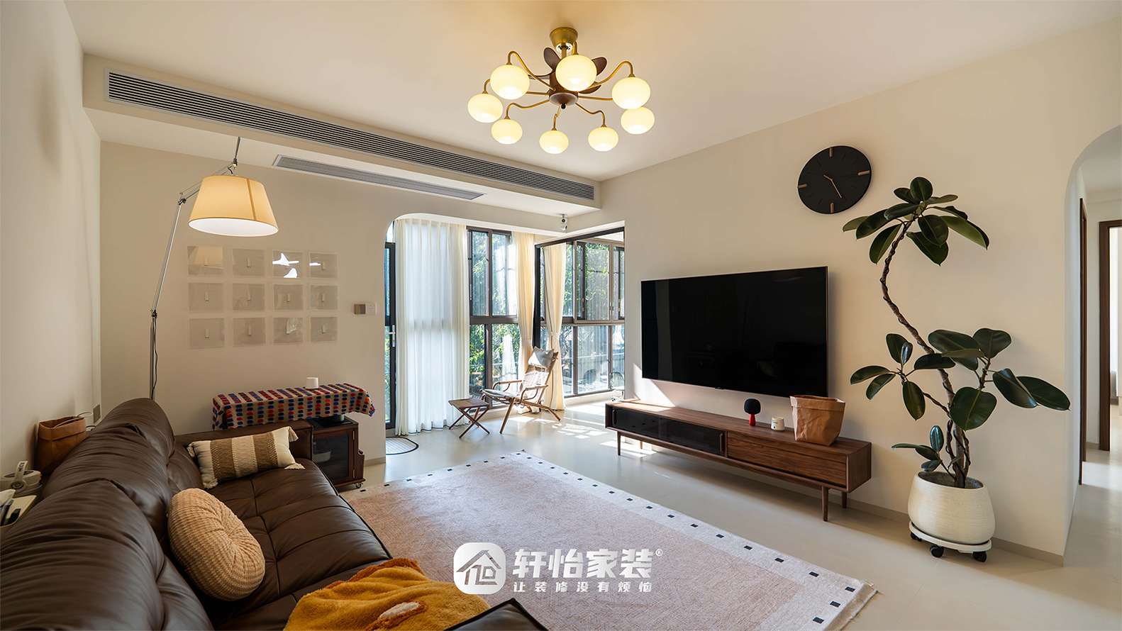 一面素白电视背景墙,一株绿植打破单调,胡桃木电视柜横向延展,搭配复古时钟,细节处尽显岁月质感;