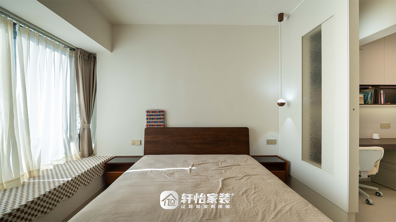 胡桃木大床线条简约,搭配柔软床垫,营造安稳的睡眠氛围;水波纹玻璃隔断轻柔分隔睡眠区与办公区,透光不透影,朦胧光影增添温柔层次;