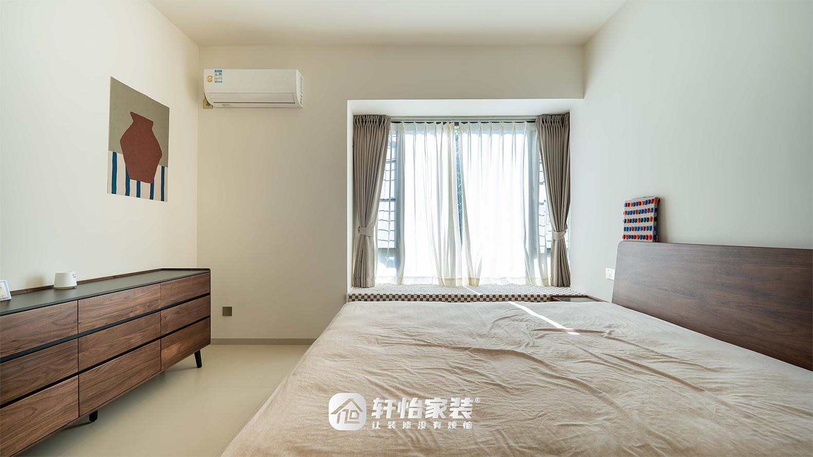 床尾的收纳柜兼具收纳与陈列功能,既可以存放衣物杂物,又能展示装饰画与收藏品,提升空间格调;