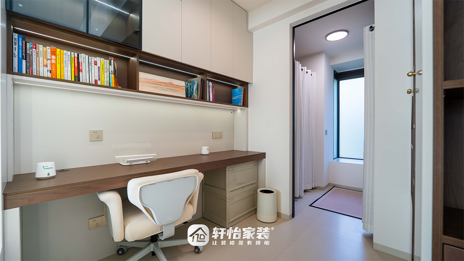 定制到顶柜,开放格陈列书籍饰品,封闭柜收纳杂物,工作阅读皆从容;一侧衣帽间采用活动挂帘,开合自由,收纳有序,私密又灵活。