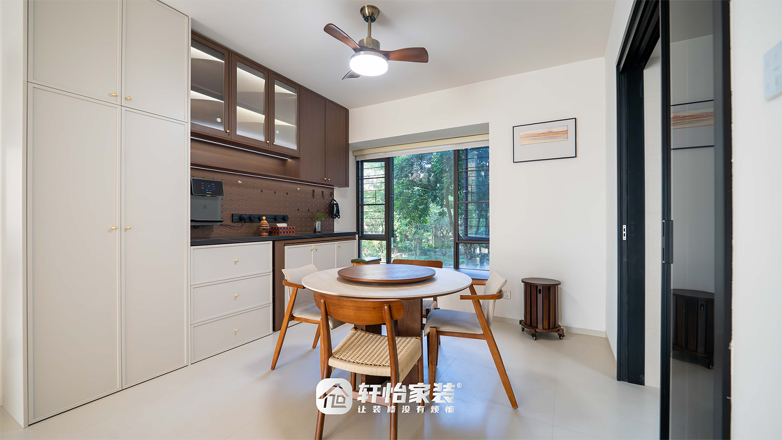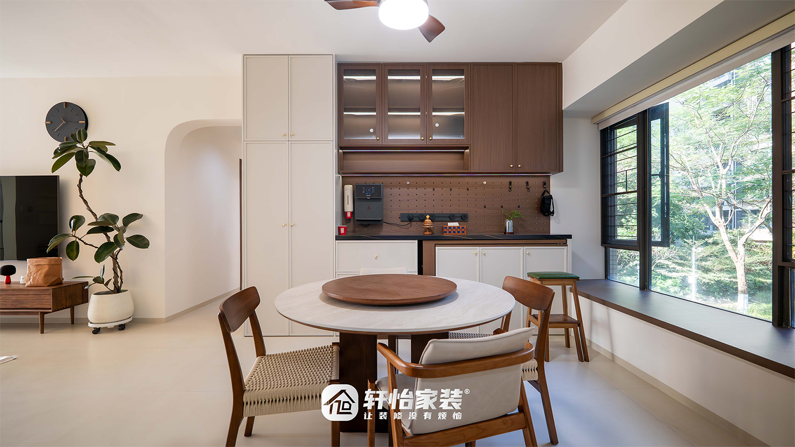 一张复式旋转餐桌界定了空间重要——下方大理石台面冷冽耐刮,上方胡桃木转盘温厚亲和,搭配能夏送凉风、冬予暖光的风扇灯,实用与氛围兼具;