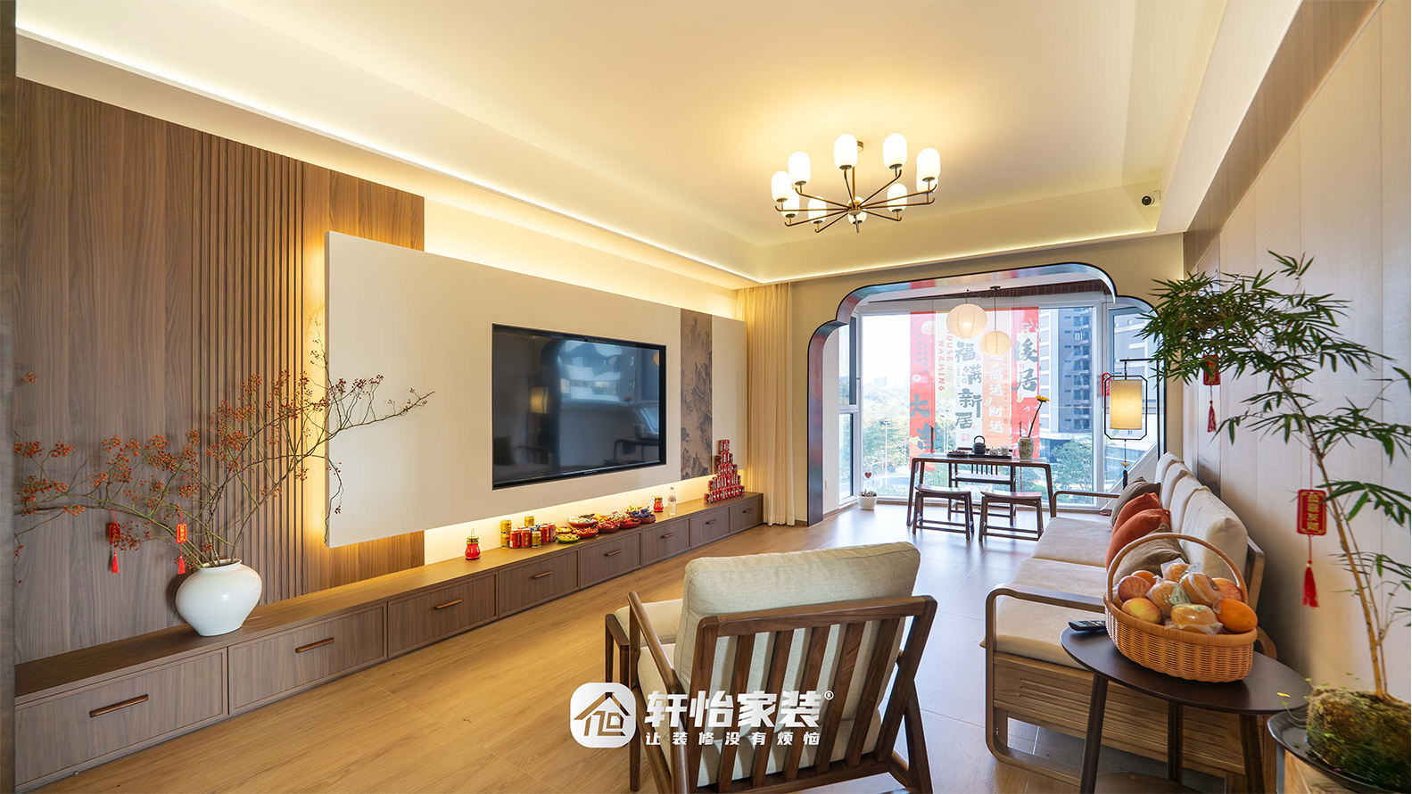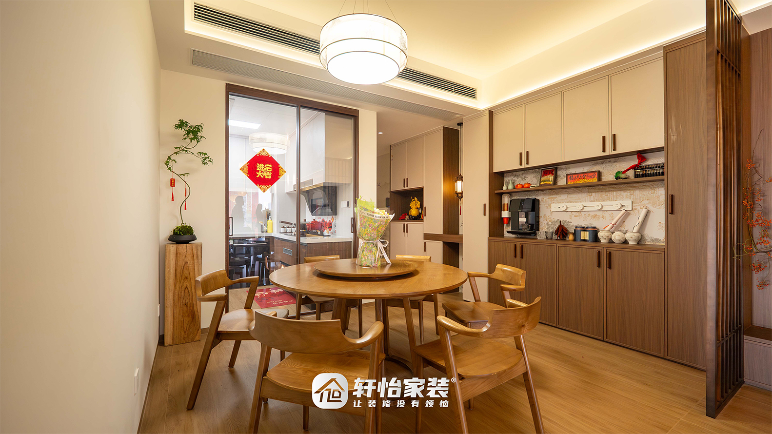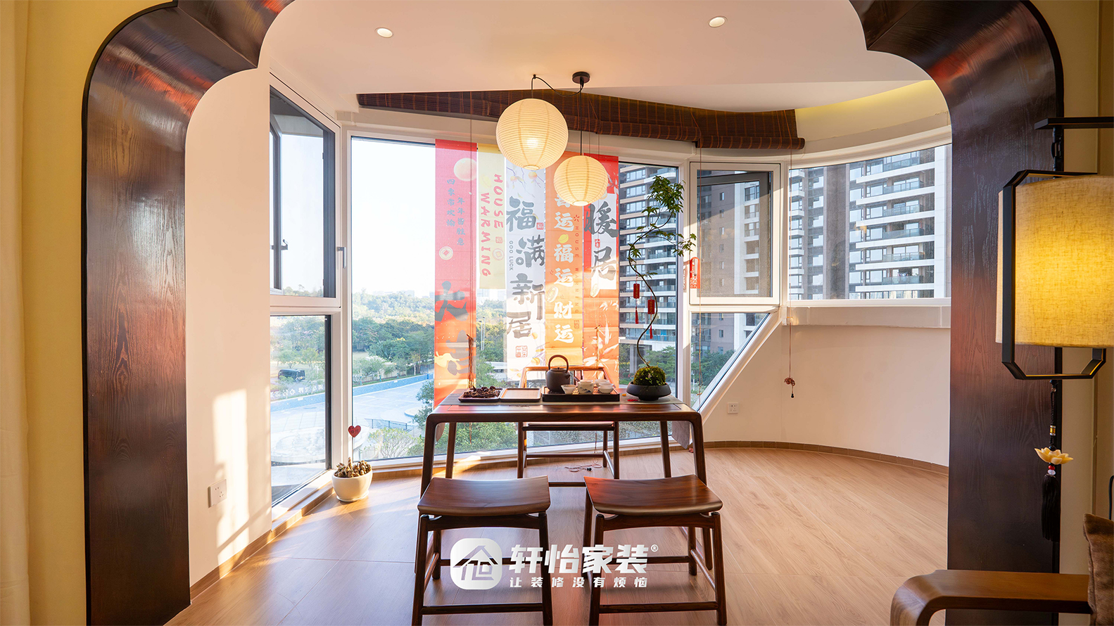 中式茶桌上方悬着双圆灯笼吊灯,垂落如满月。日光盈室,既可品茗赏景、展卷静读,亦能与好友围坐对谈,茶*微袅间,功能与诗意在此自然相融。