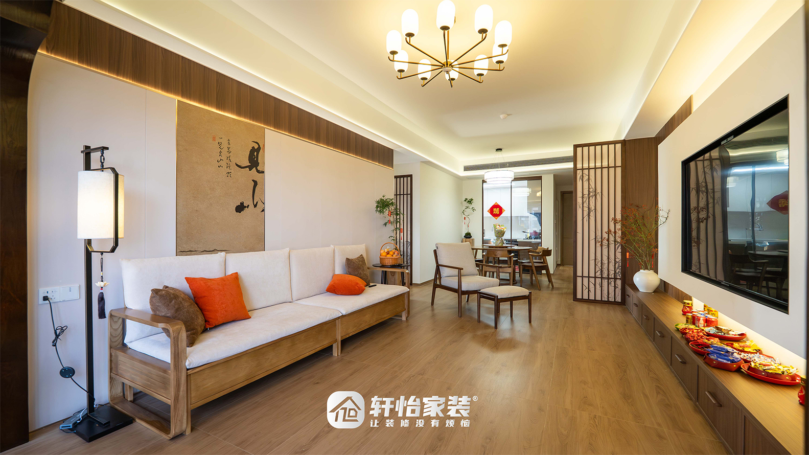 胡桃实木沙发沉稳含禅意,棉麻布艺坐垫温润舒适,橙棕抱枕点缀素色,添一抹暖意。沙发背靠白色木饰墙,中心一幅字画挂轴点睛,笔墨间藏着东方意趣,左侧一盏中式落地灯静静伫立,灯影斜照,不夺主位却自有存在。