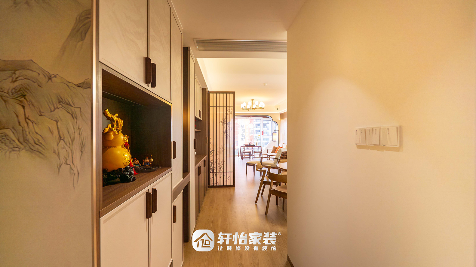 抬步入室,山水纹路的顶天立地玄关柜依墙而立,风雅暗藏。