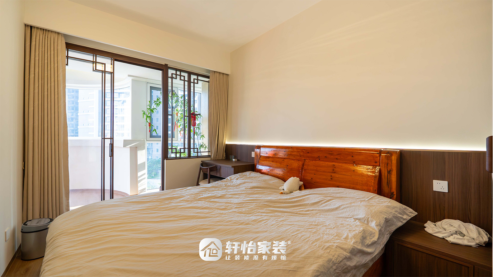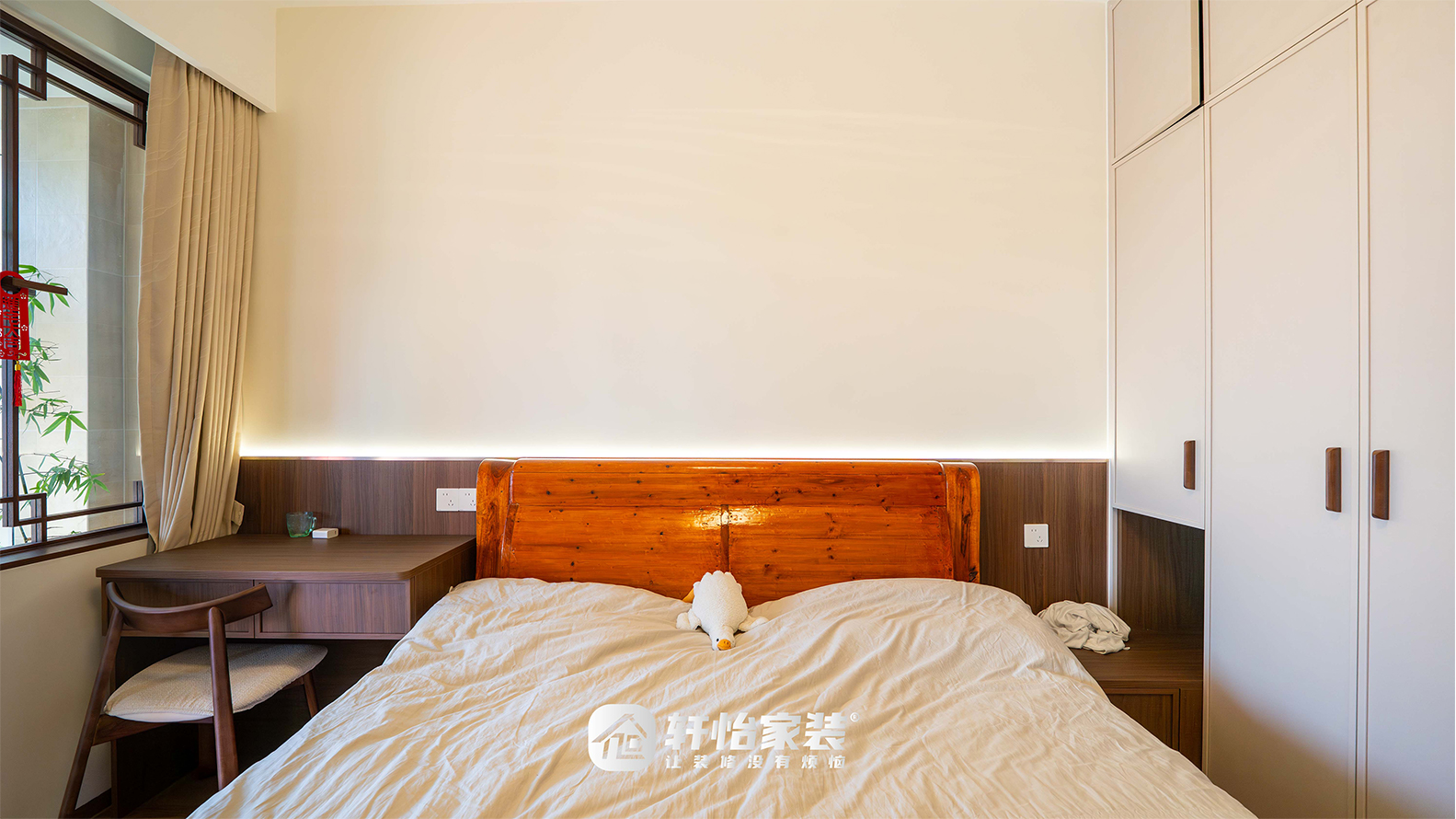 红木床木质纹理清晰,敦实质感自带中式沉稳与温润,搭配素色床品与毛绒玩具,沉稳中透出生活的柔软;床头背景墙为半墙胡桃木饰面,内嵌灯带,夜起泛出柔光,不扰眠且添细腻氛围;
