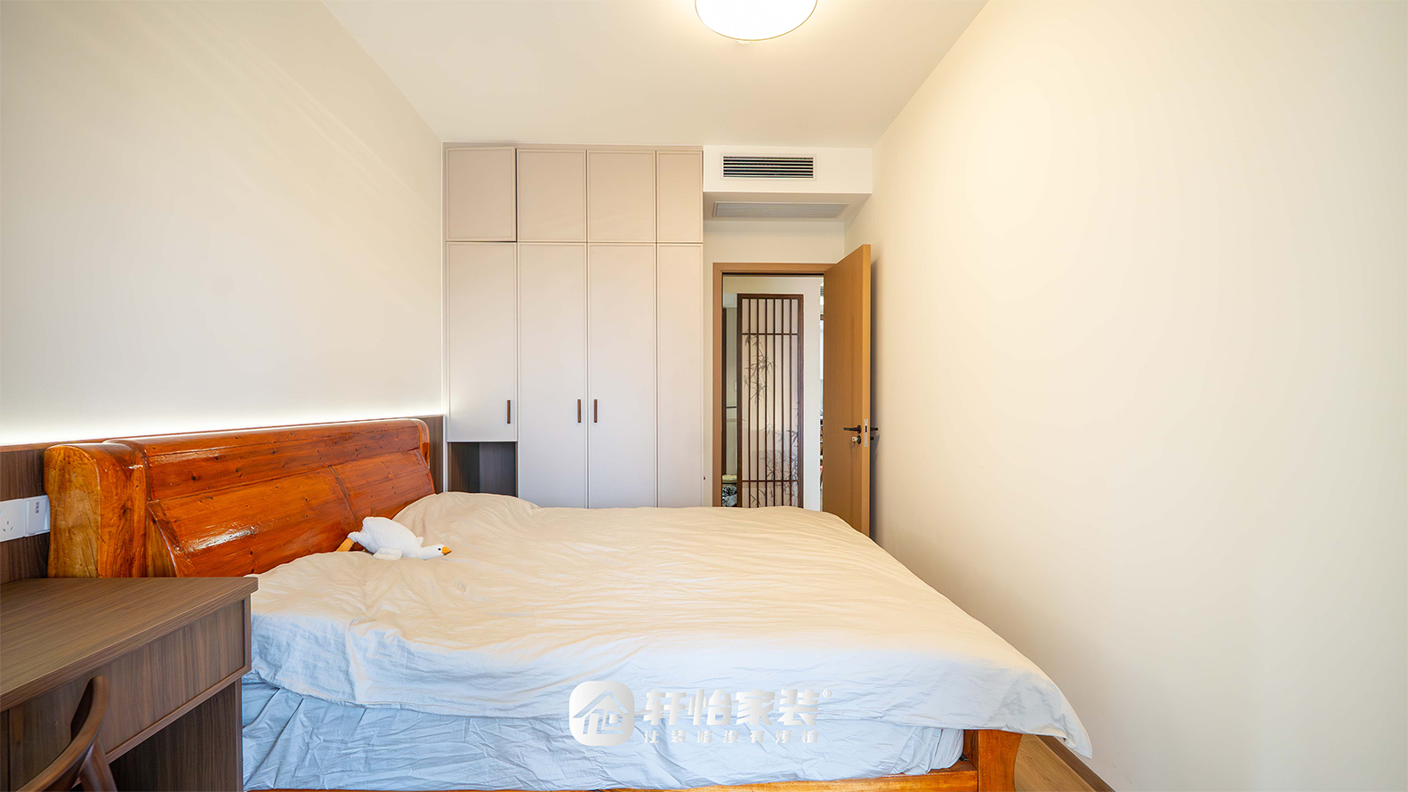在主卧,一张红木床成为空间的视觉焦点,形制温厚,自带宋式器物的沉静气韵。