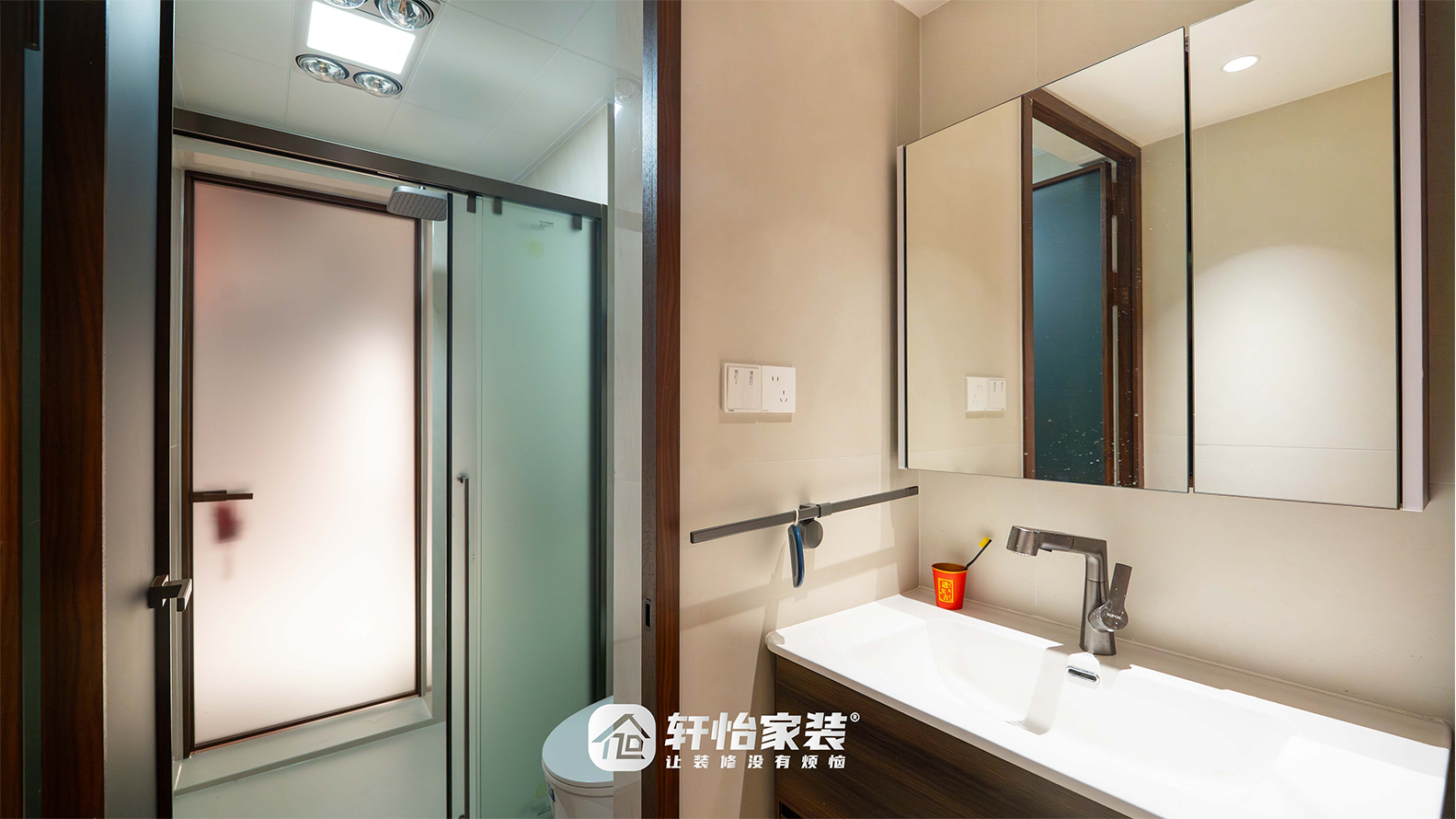 卫生间采用干湿分离设计,淋浴区以透明玻璃门隔断,避免水汽外溢;墙面通铺米色哑光砖,缝隙极小,浑然一体;木质浴室柜、镜框、古铜质感的领进,在素净背景中形成精致点缀,方寸空间尽显雅致格调。