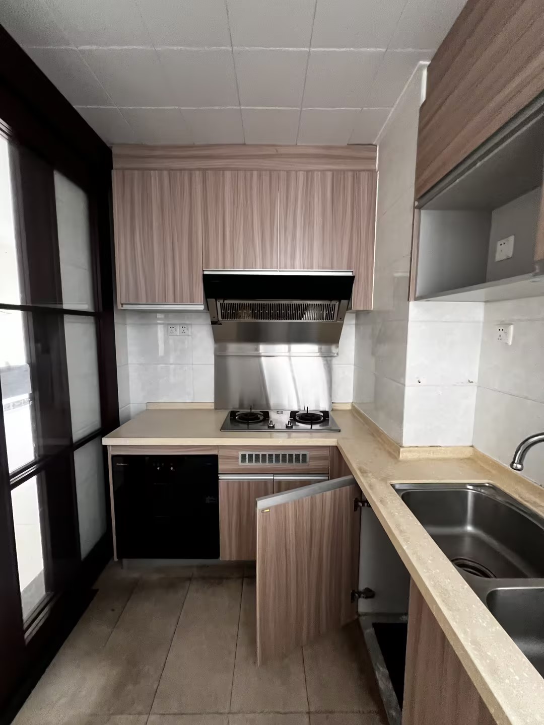 原厨房空间局促封闭,自然采光不足,传统木纹橱柜与米色台面的搭配陈旧过时,缺乏设计感,封闭式布局更阻碍了家人间的互动交流,功能与美感均亟待提升。