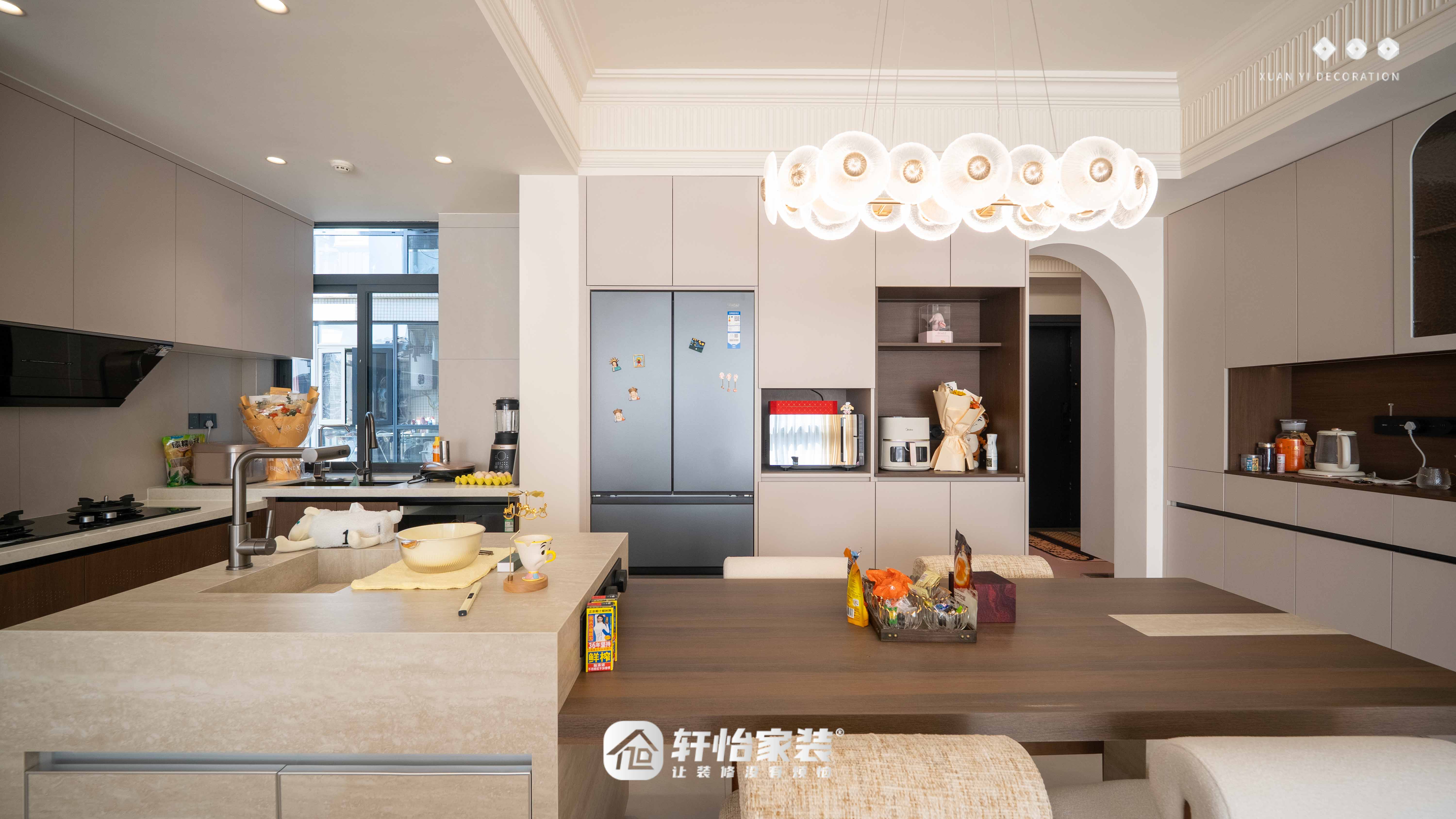 紧邻岛台的两侧墙面,定制了通顶的满墙餐边柜,强大的收纳能力确保台面清爽整洁。柜体的开放格可放置咖啡机、水杯等常用物品,既保证取用便捷,又以统一的设计语言延续了轻法式的优雅质感,让餐厨空间整洁有序又不失格调。