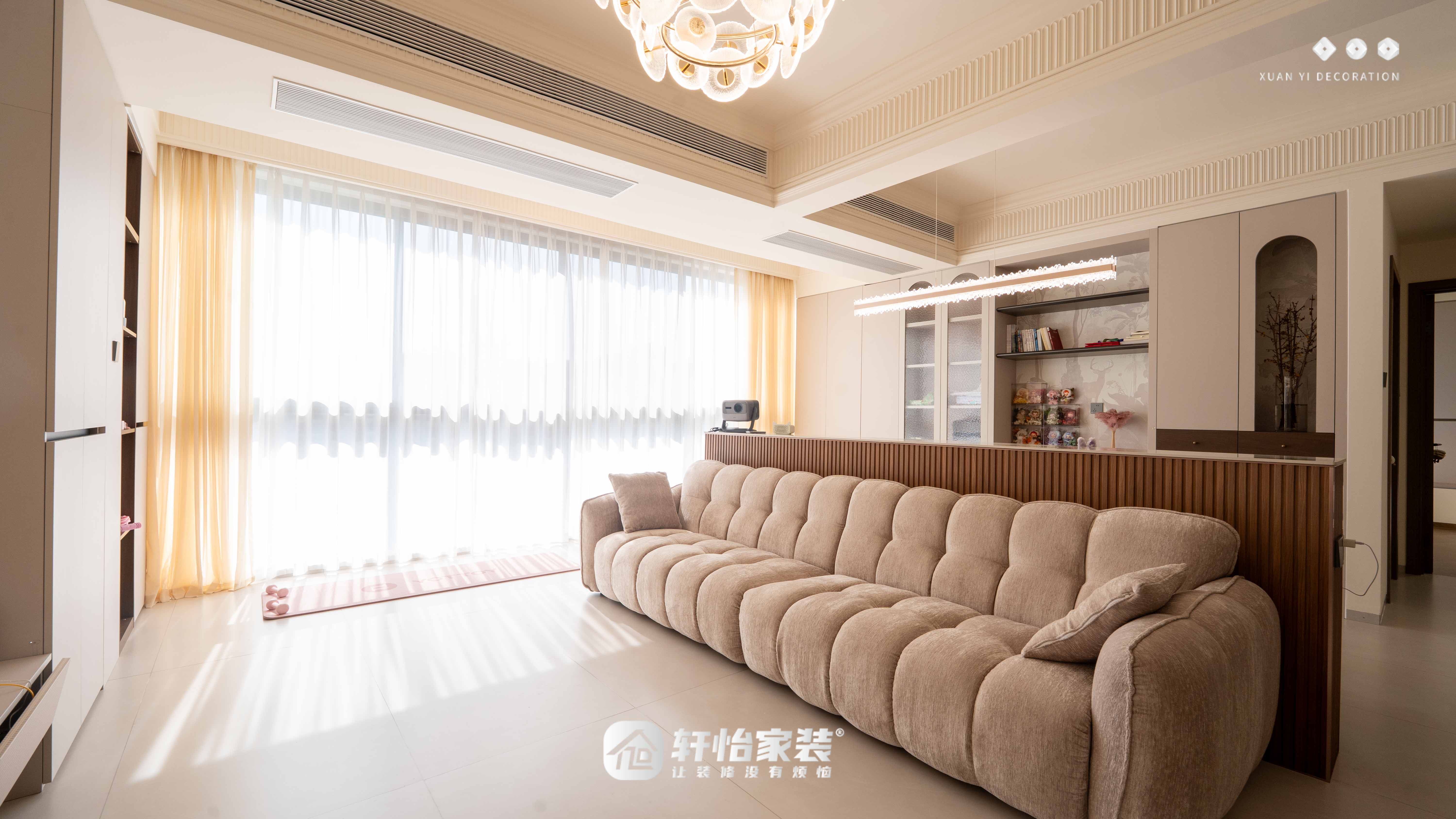 阳台一侧的定制收纳柜,中间开放格既能摆放装饰摆件,也能收纳运动器材;窗边的开阔空间,足够从容铺开瑜伽垫,双层纱帘滤出柔光,光影缓缓流淌,在这方自在的角落,随时都能开启一场舒展身心的锻炼时光;