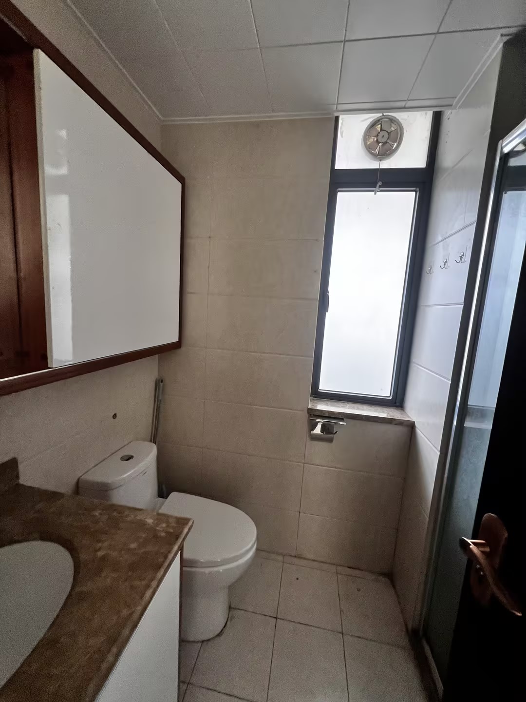 淋浴房玻璃门厚重且边框明显,割裂了空间,影响采光与通透感。洗手台及镜柜样式陈旧,收纳功能不足,台面易显杂乱,整体呈现压抑氛围,整体功能与美观度均待提升。
