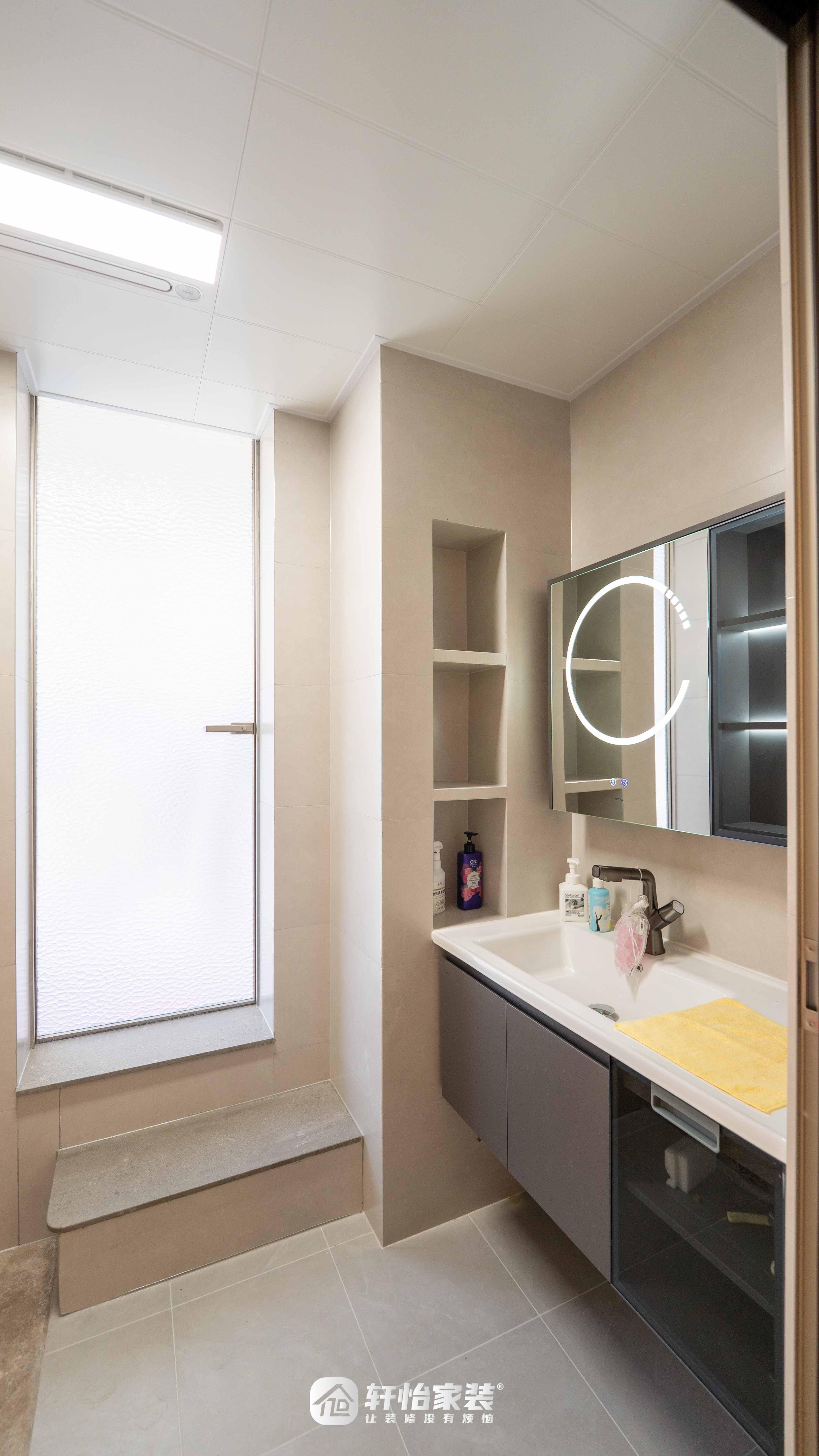 智能镜柜提供多层储物空间,墙面壁龛进一步增加收纳容量,避免台面杂乱,让洗漱用品井然有序。