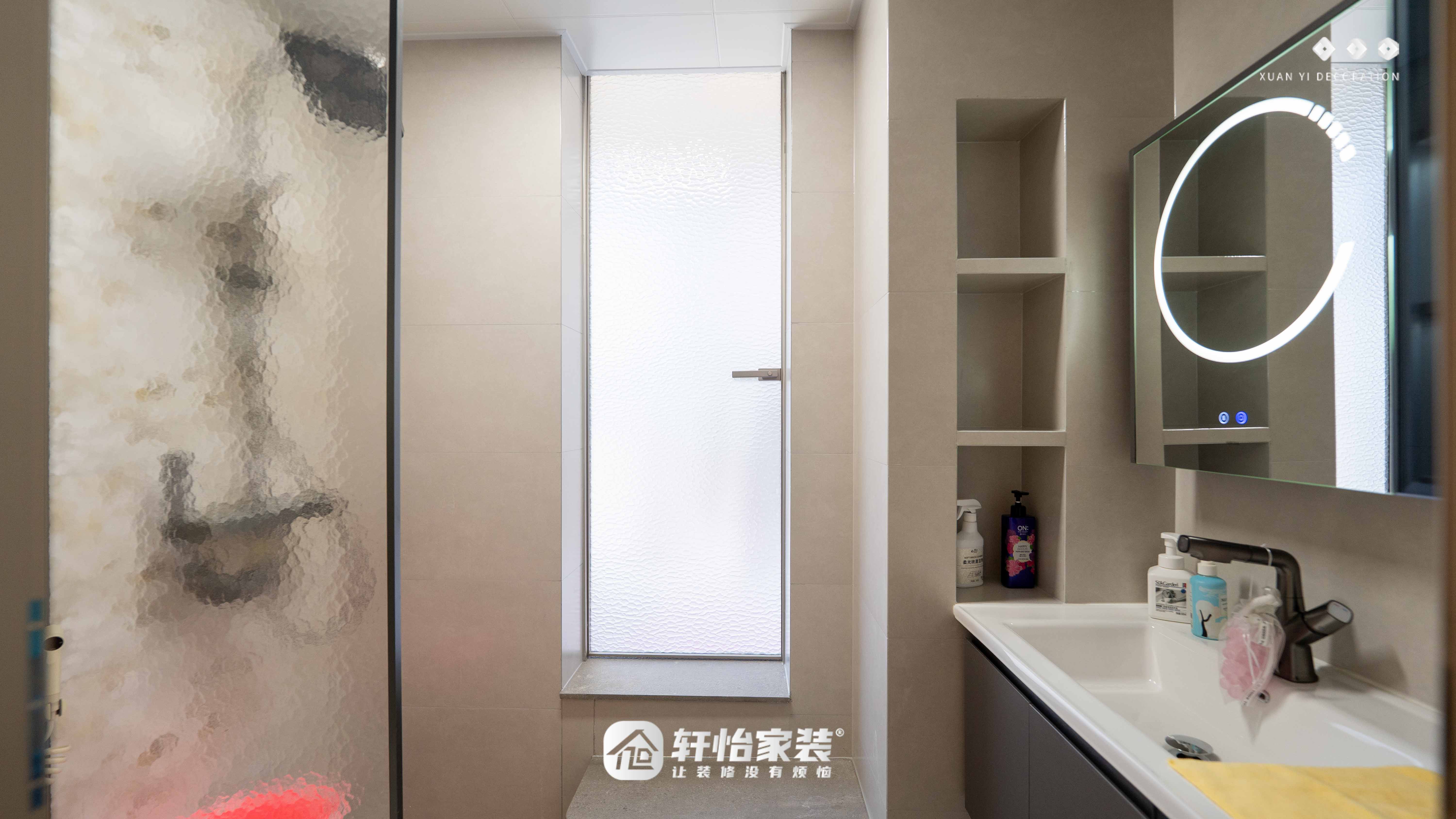 卫生间采用干湿分离设计,空间整体明亮通透。水波纹玻璃窗既保护隐私,又让光线折射出柔和纹理,整体色调清爽统一,透着法式的精致感。