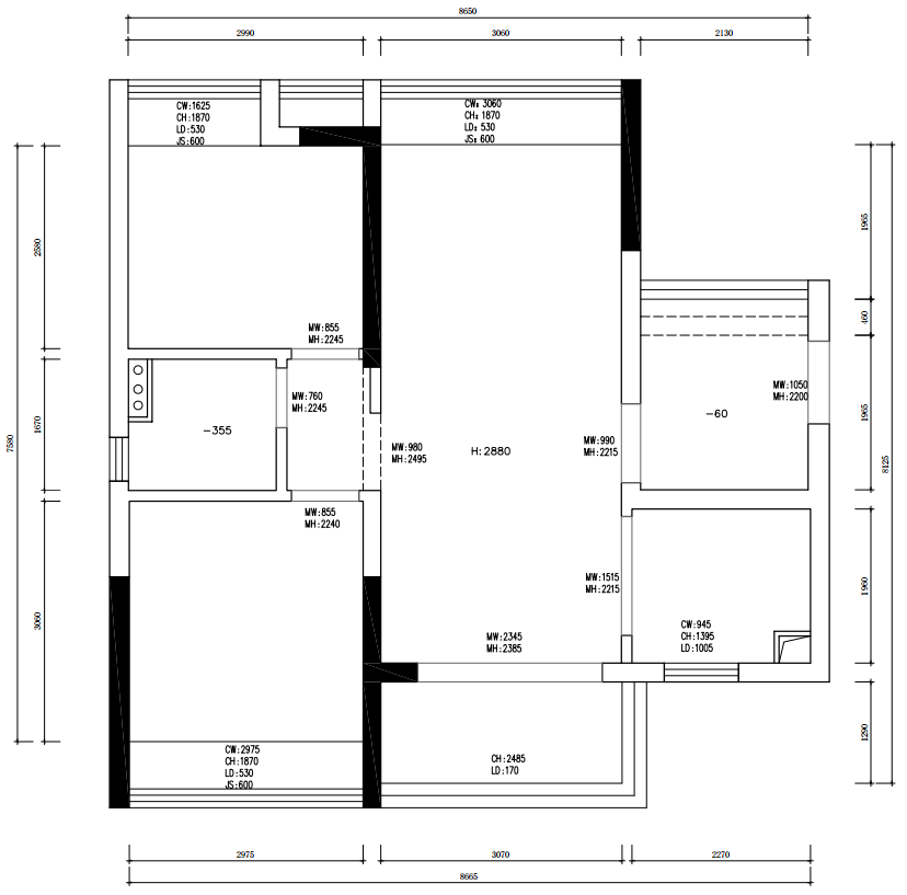 ①厨房与玄关隔墙的移位,为烹饪空间注入了更多可能;