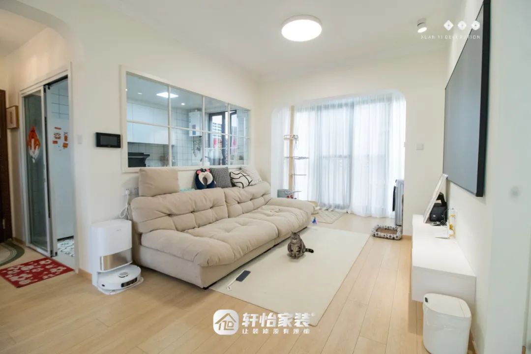 客厅,作为家的颜值担当,以深浅不一的白与米色为主调,辅以圆润的拱形设计,通铺的木地板更添温馨。