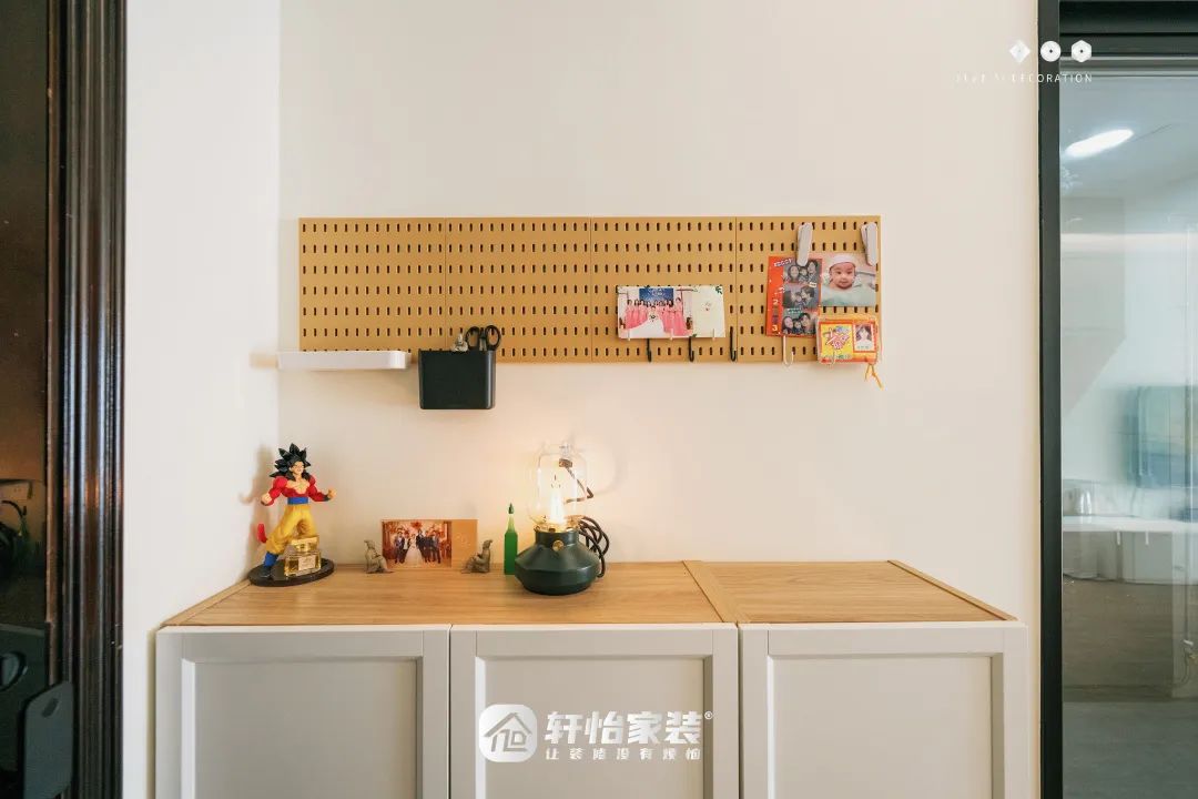 玄门因横梁所限,巧妙选用成品半高柜,现代材料与传统配色相得益彰,营造出日常的暖色氛围。几张照片、一块洞洞板,零星的摆件与复古小灯,轻松划定玄关意境。