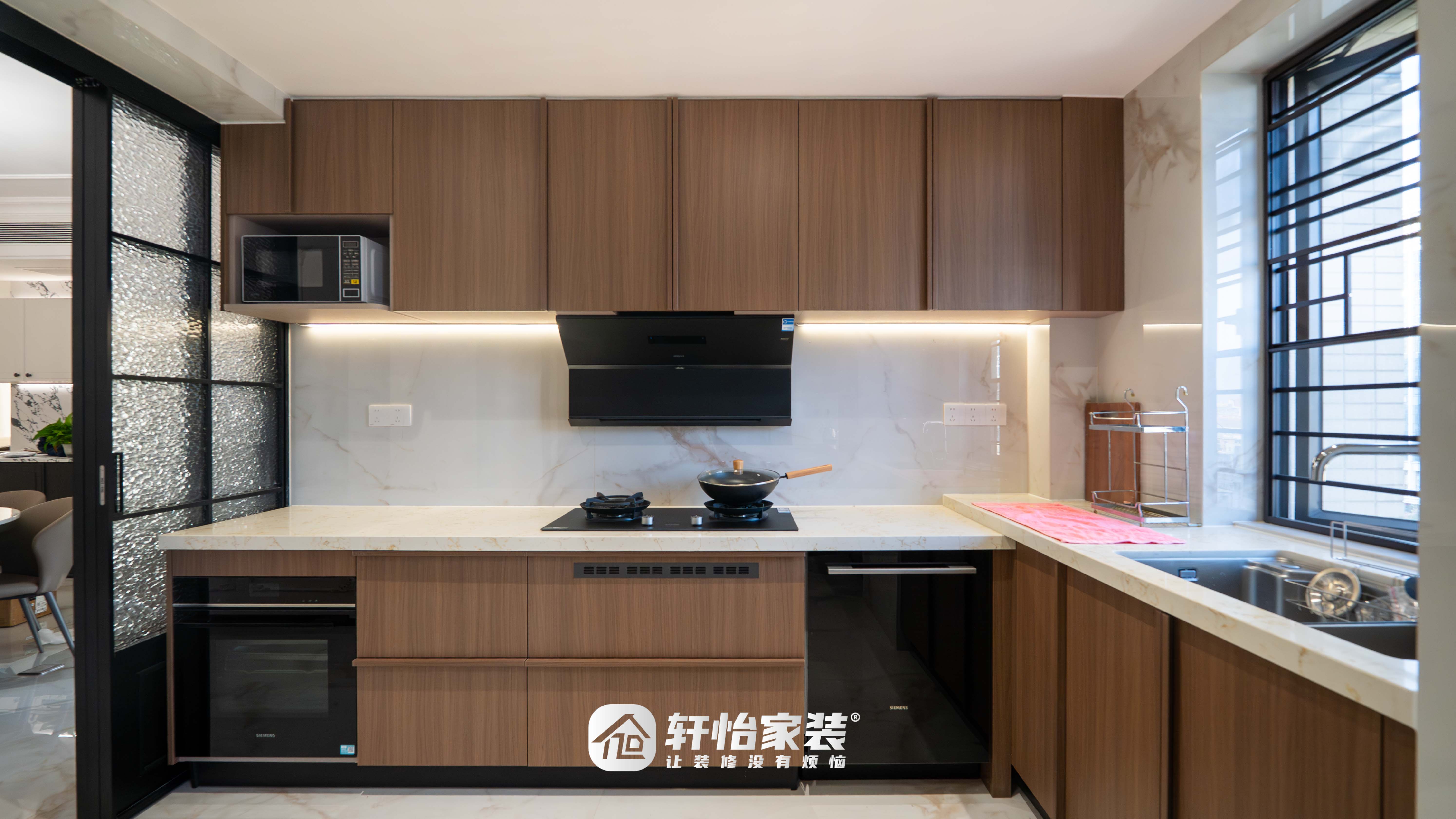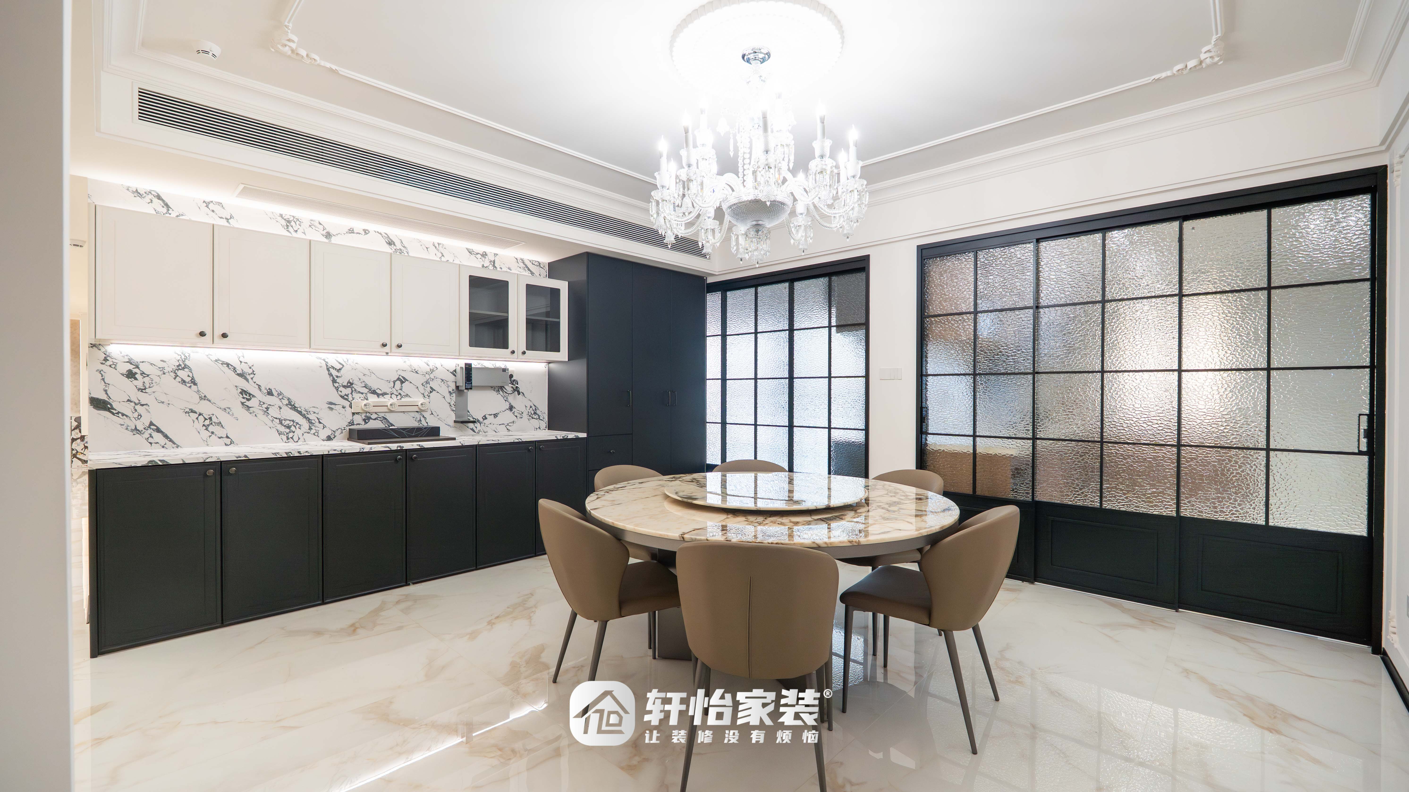 一扇极简黑色边框的玻璃推拉门是点睛之笔,门上的水波纹玻璃若隐若现,既隔绝了油烟,又保证了光线的通透。胡桃木收纳柜温润自然,与全屋法式复古风格保持统一,每一个细节都在诉说着对品质生活的追求。