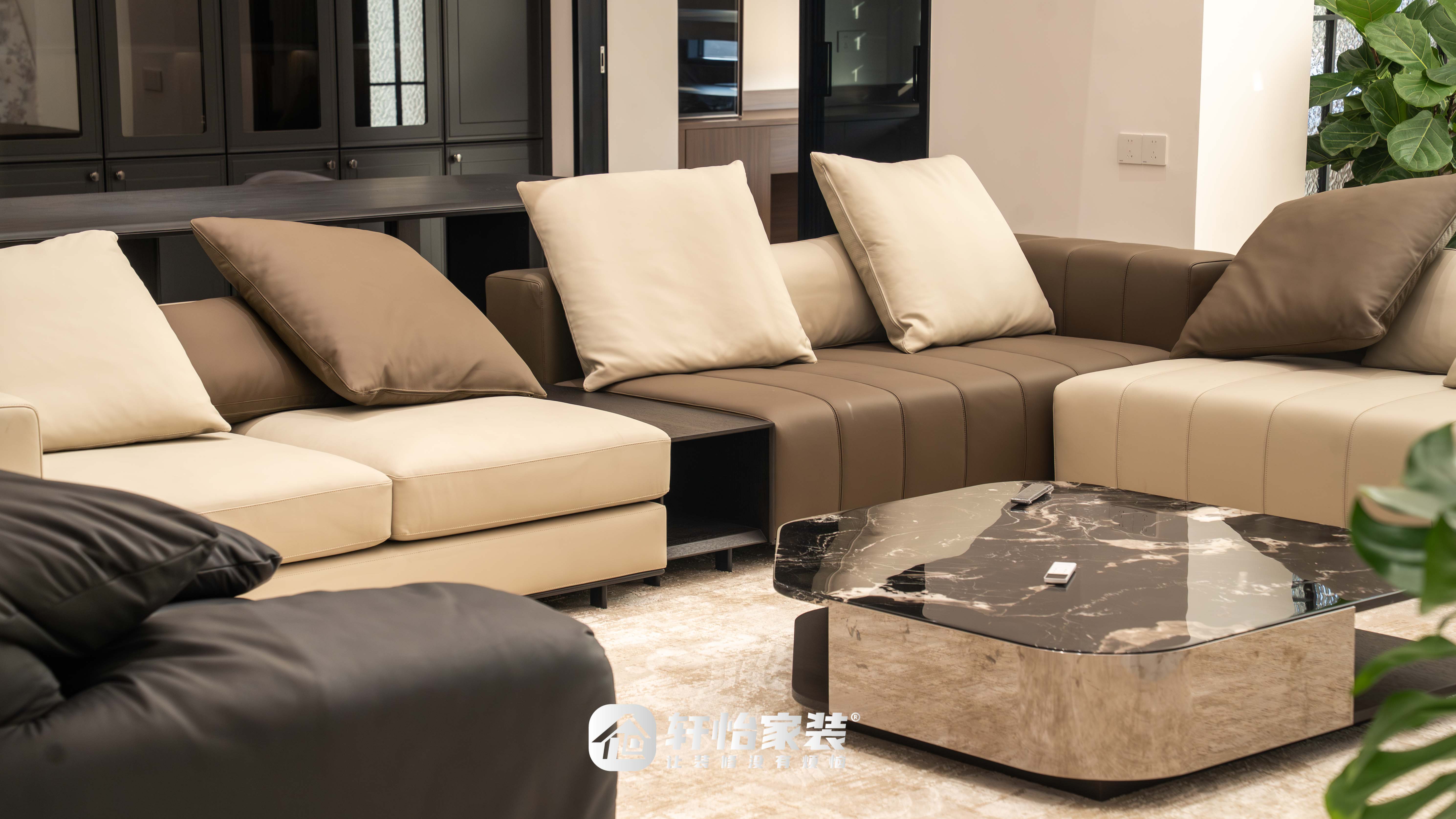 真皮沙发采用黑、棕、杏三色拼接,为空间注入层次与高等感。黑色岩板几何茶几线条利落,与深邃复古的拼色皮质沙发相得益彰,一刚一柔间,奠定了空间干练大气的基调;