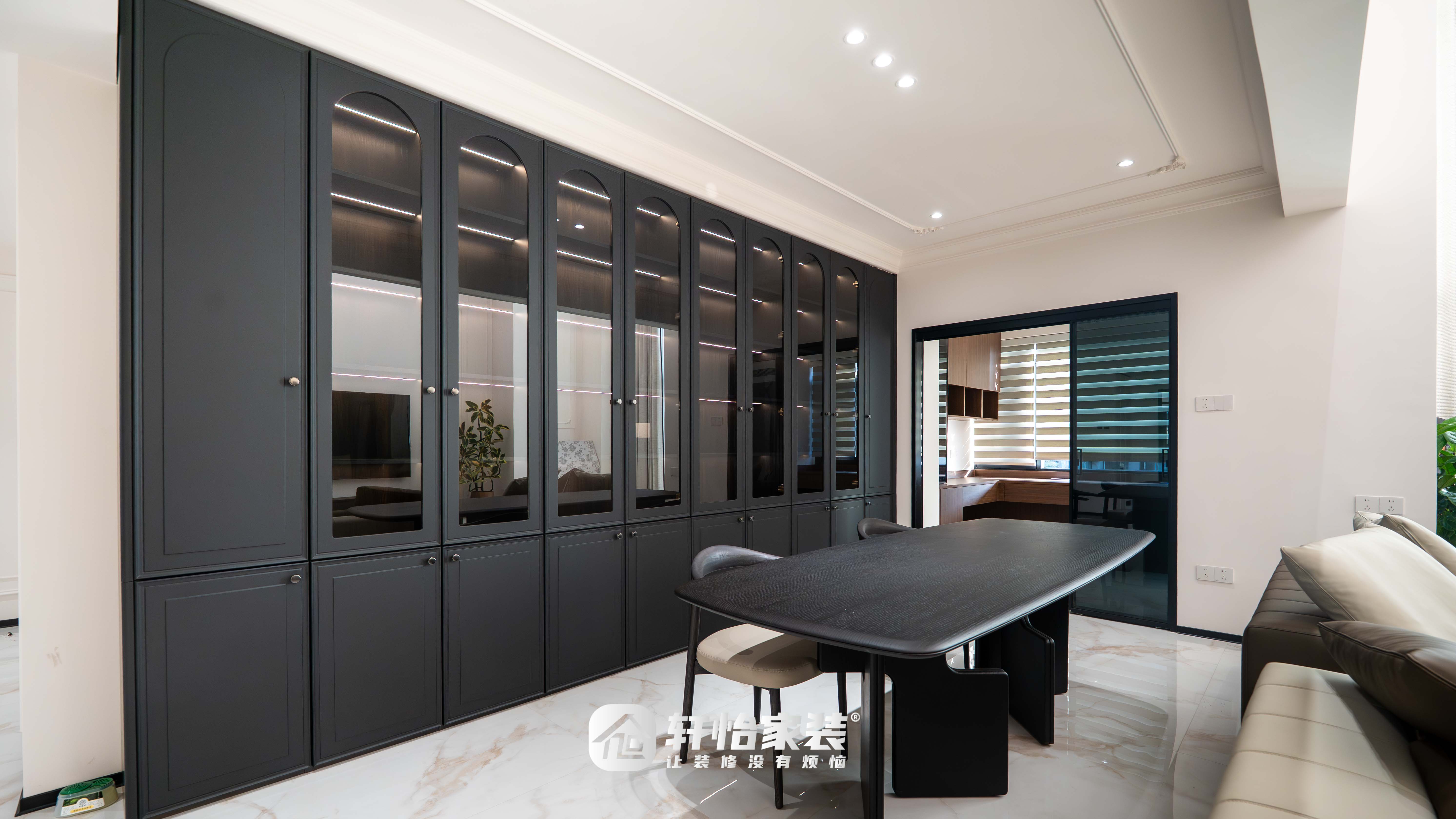 沙发后方定制整墙收纳柜,黑色封闭与玻璃柜错落相间,内嵌灯带柔和点亮藏品。玻璃柜让心爱之物得以优雅陈列,封闭柜则藏起日常杂物,收纳与展示各得其所;