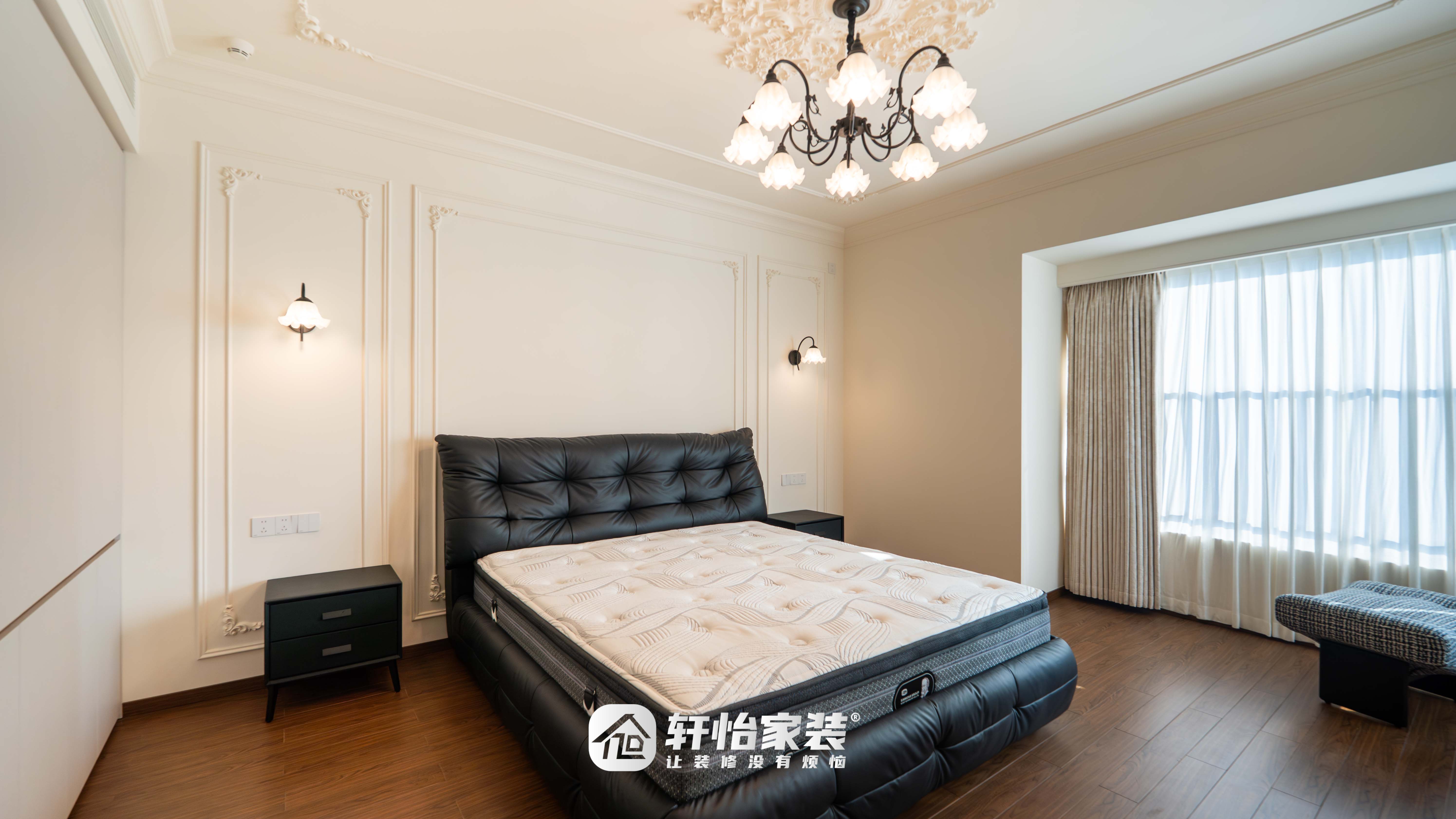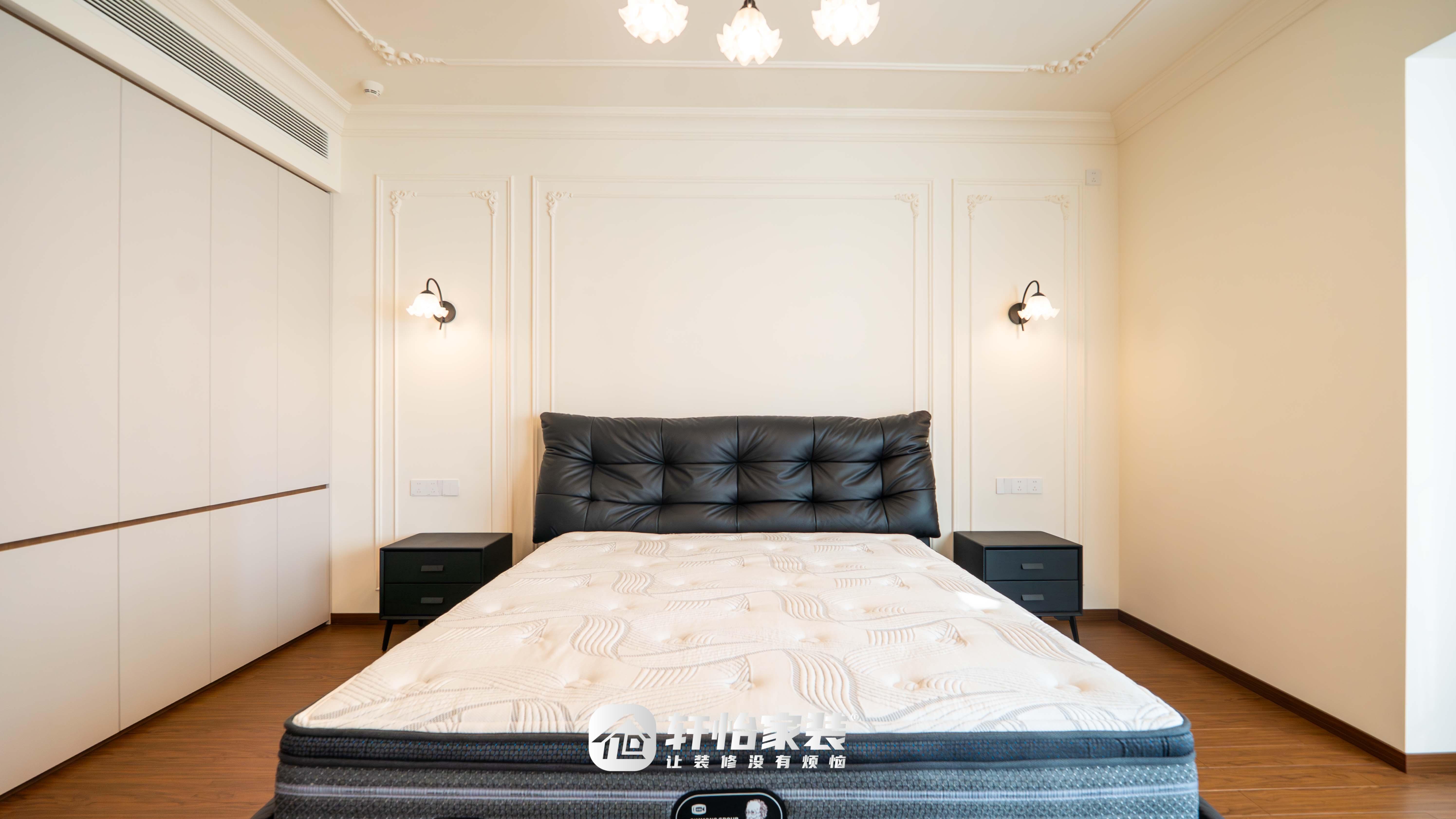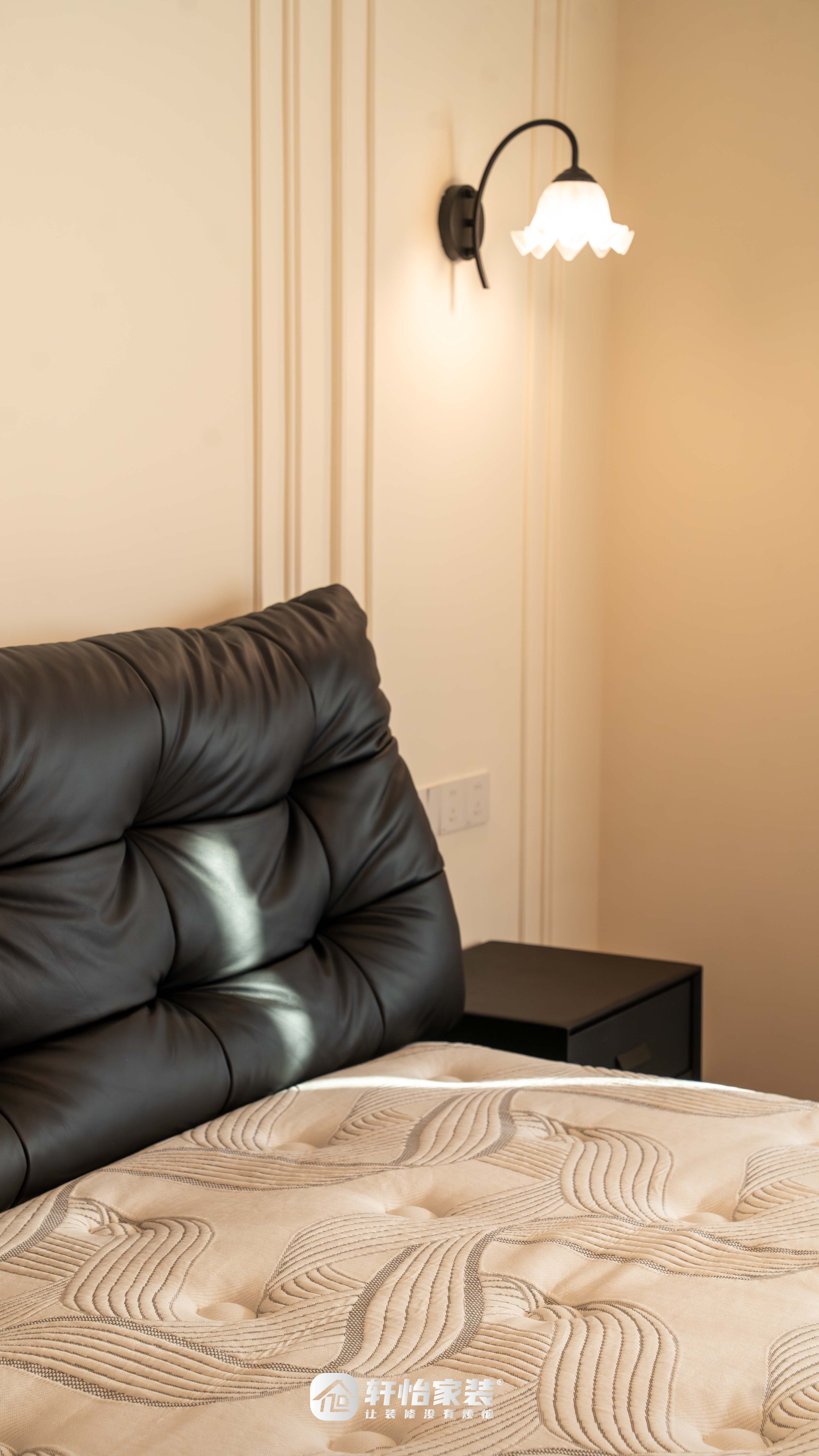 黑色软包床头触感舒适,两侧花朵壁灯兼具照明与装饰之美,法式浪漫的雅致尽显其间;
