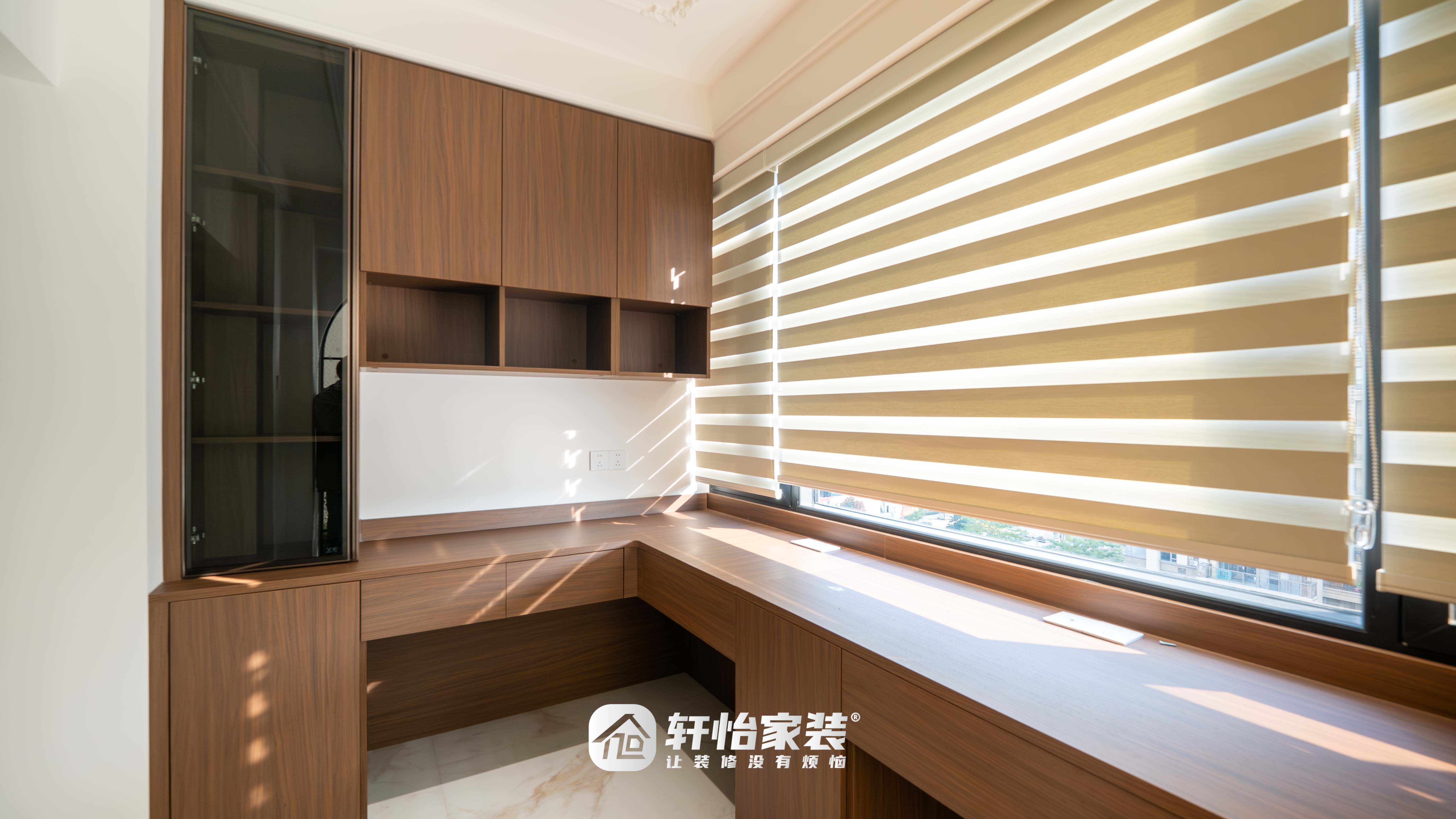 上方吊柜融合封闭柜、开放格与玻璃柜,书籍整齐藏纳,心爱小物优雅陈列,取用便捷。白色百叶帘自由调节光线,光影流转间,为阅读时光平添几分静谧的仪式感。