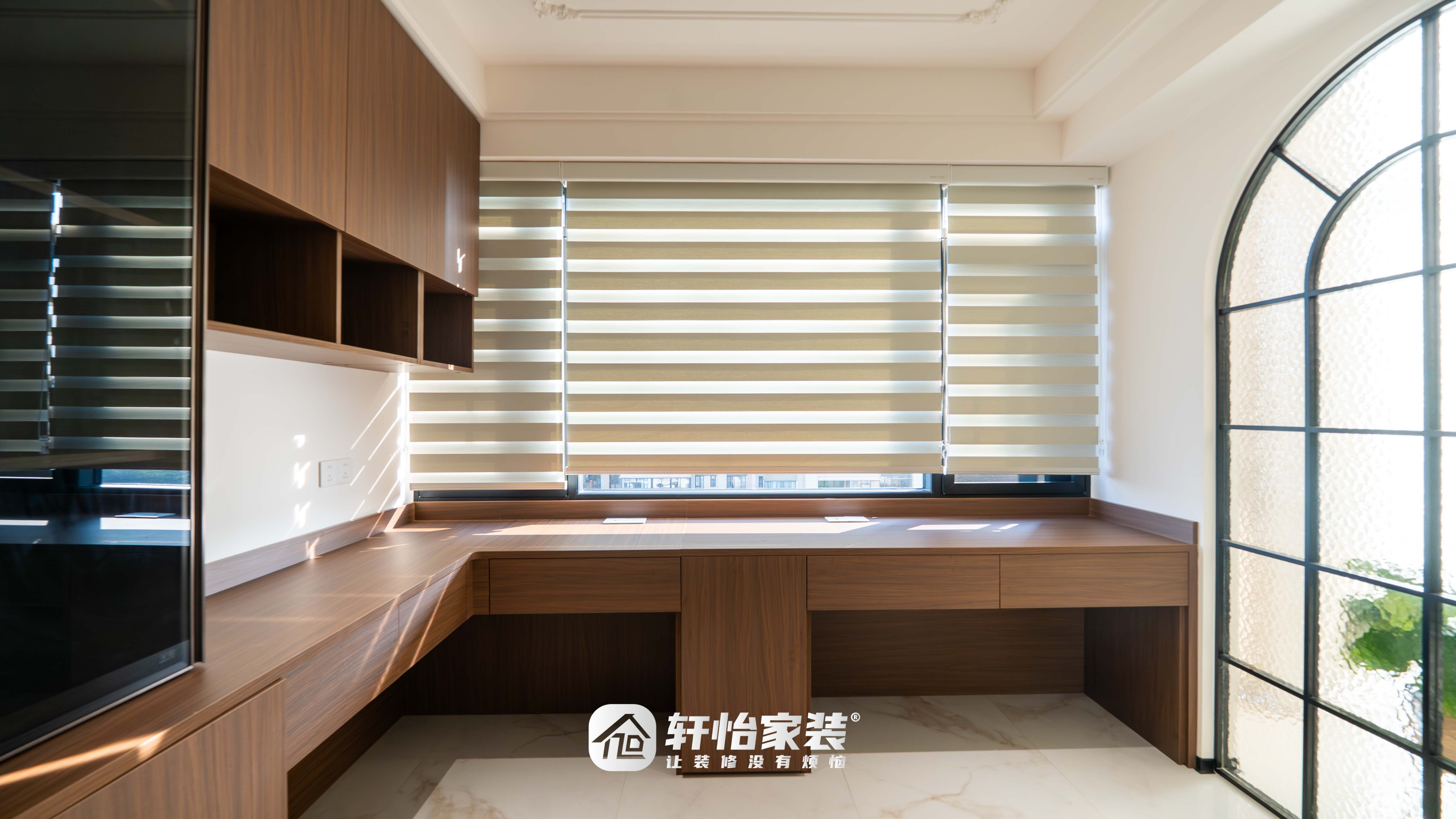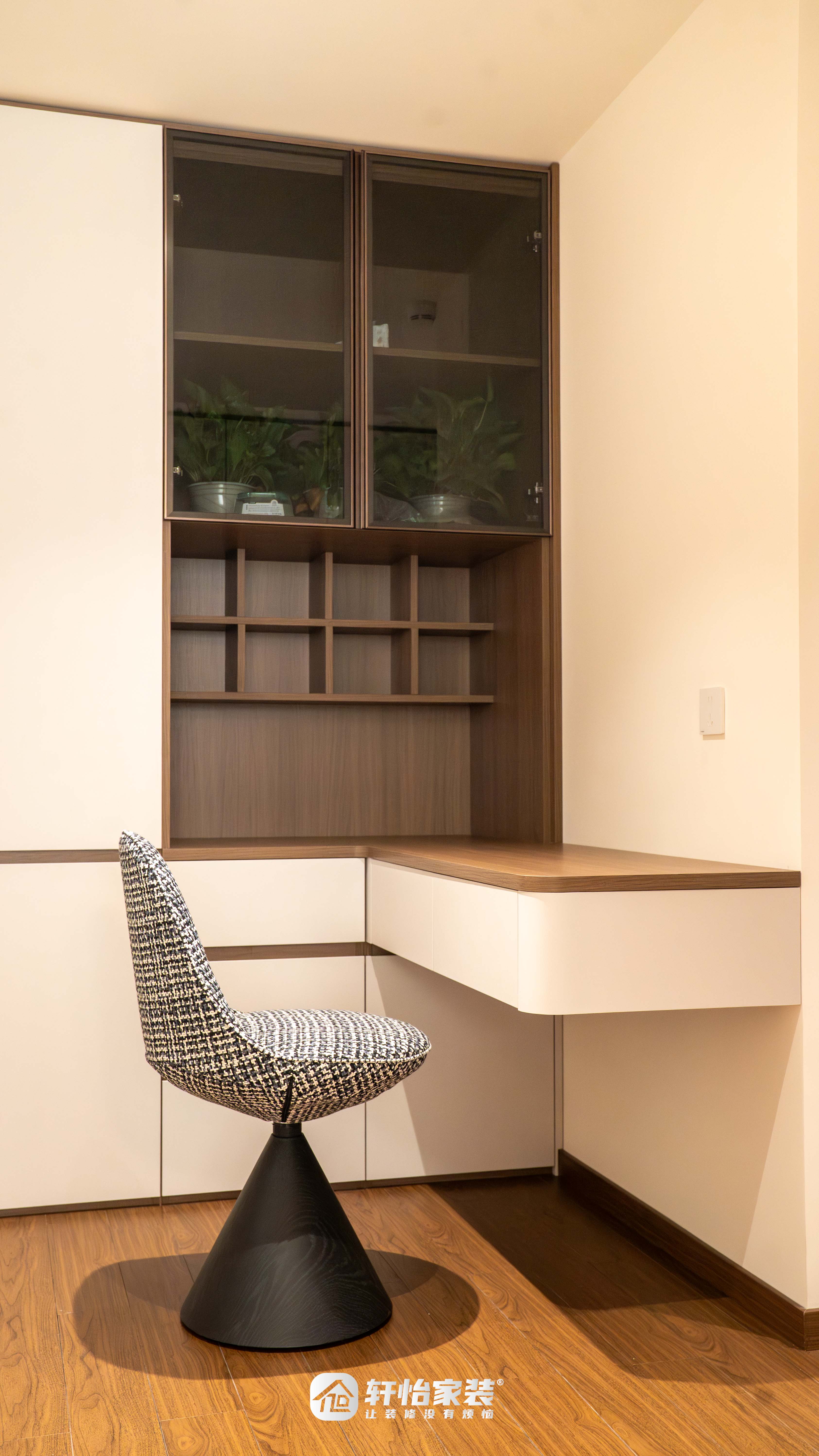 相邻的书房区域,胡桃木L型书桌沿墙而设,台面宽敞舒展,无论是专注办公还是静心阅读,都能自在沉浸。