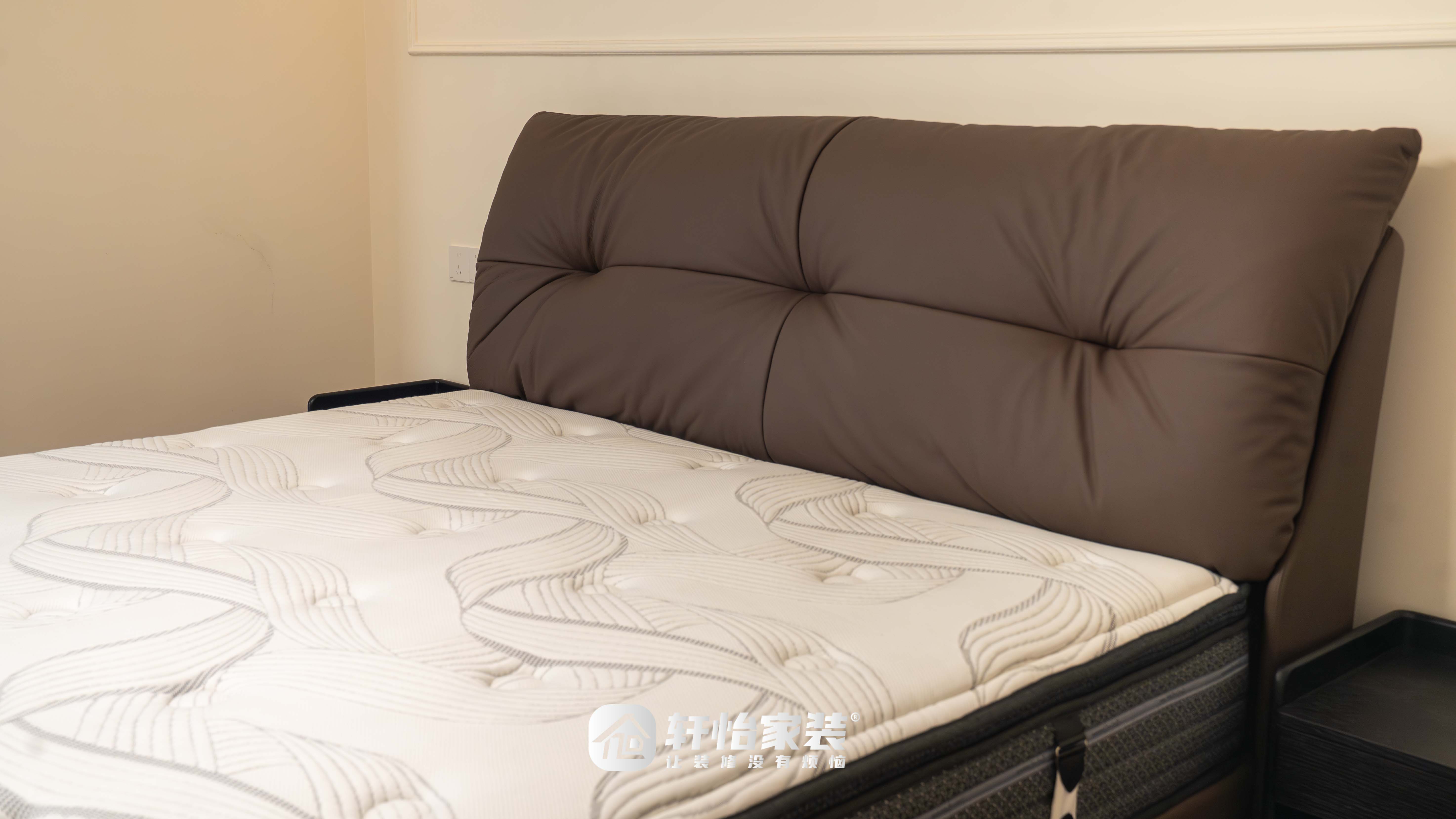 小次卧整体风格简约大气,是清爽利落的休憩空间。胡桃实木温莎床的波浪雕花设计尽显法式浪漫,细腻木质纹理更添自然气息。棕色的实木床头柜小巧精致,可妥善归纳零碎物品,让起居更便捷。