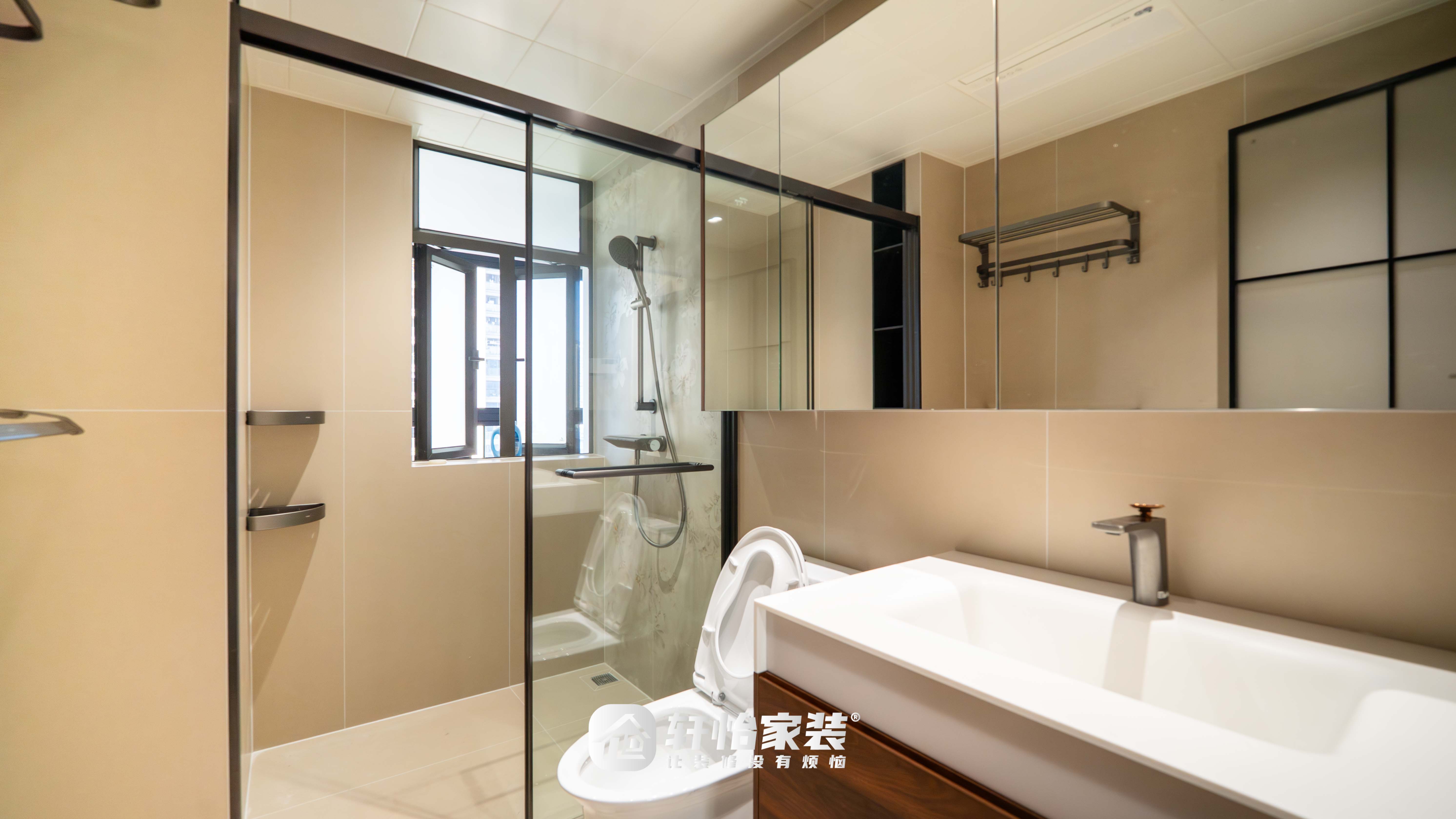 卫生间以奶杏色为基调,通过干湿分离的科学布局,塑造出一个洁净、耐看的沐浴空间。洗漱区与淋浴区清晰划分,避免水汽蔓延,保持空间干燥,适配家庭日常生活需求。