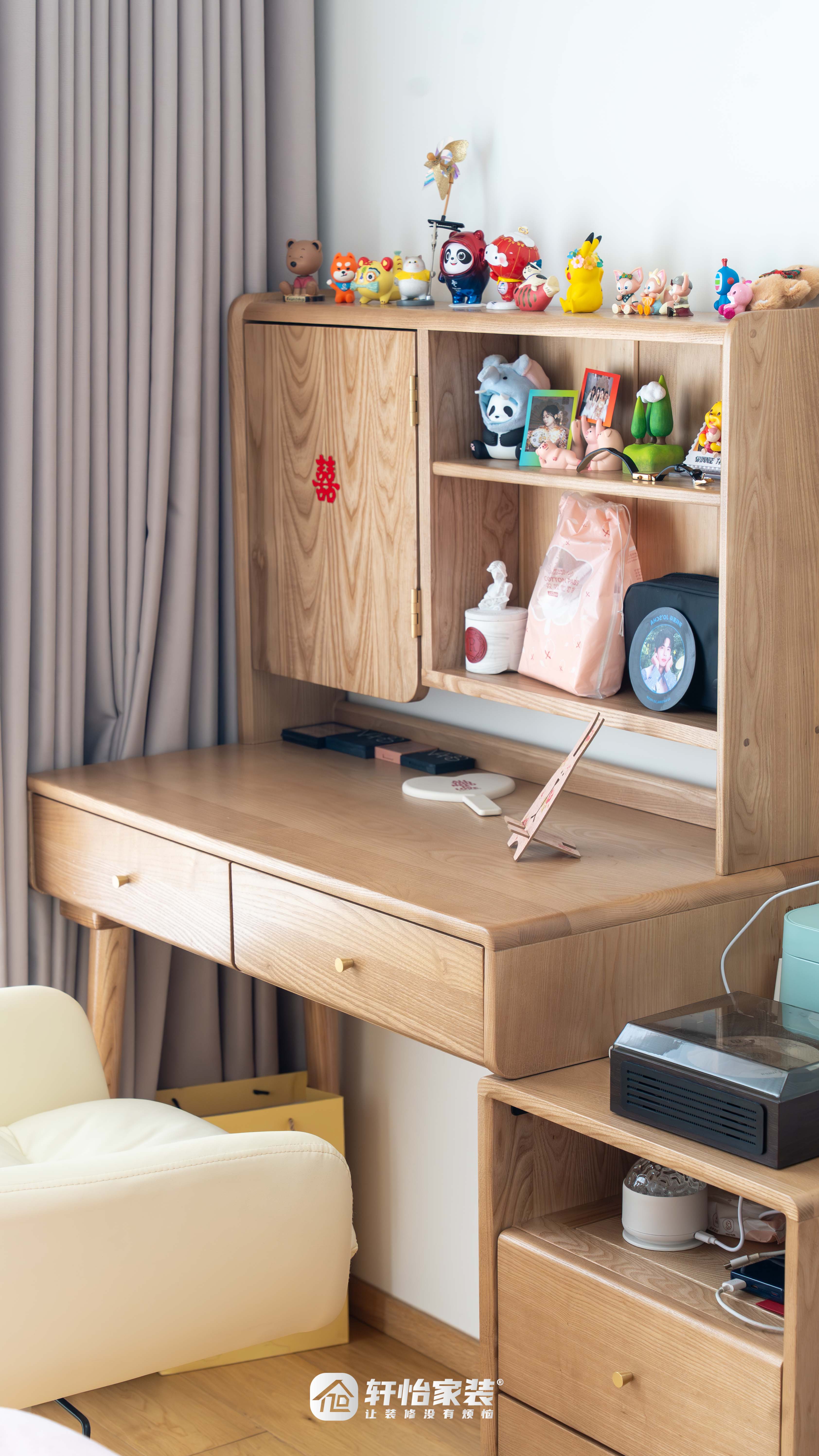 床尾靠墙放置一张原木长桌,桌面宽敞,开放格内可摆放书籍、摆件或收纳日常小物,既能作为梳妆台,也能临时办公。整体简约克制,却处处透着舒适的生活秩序。