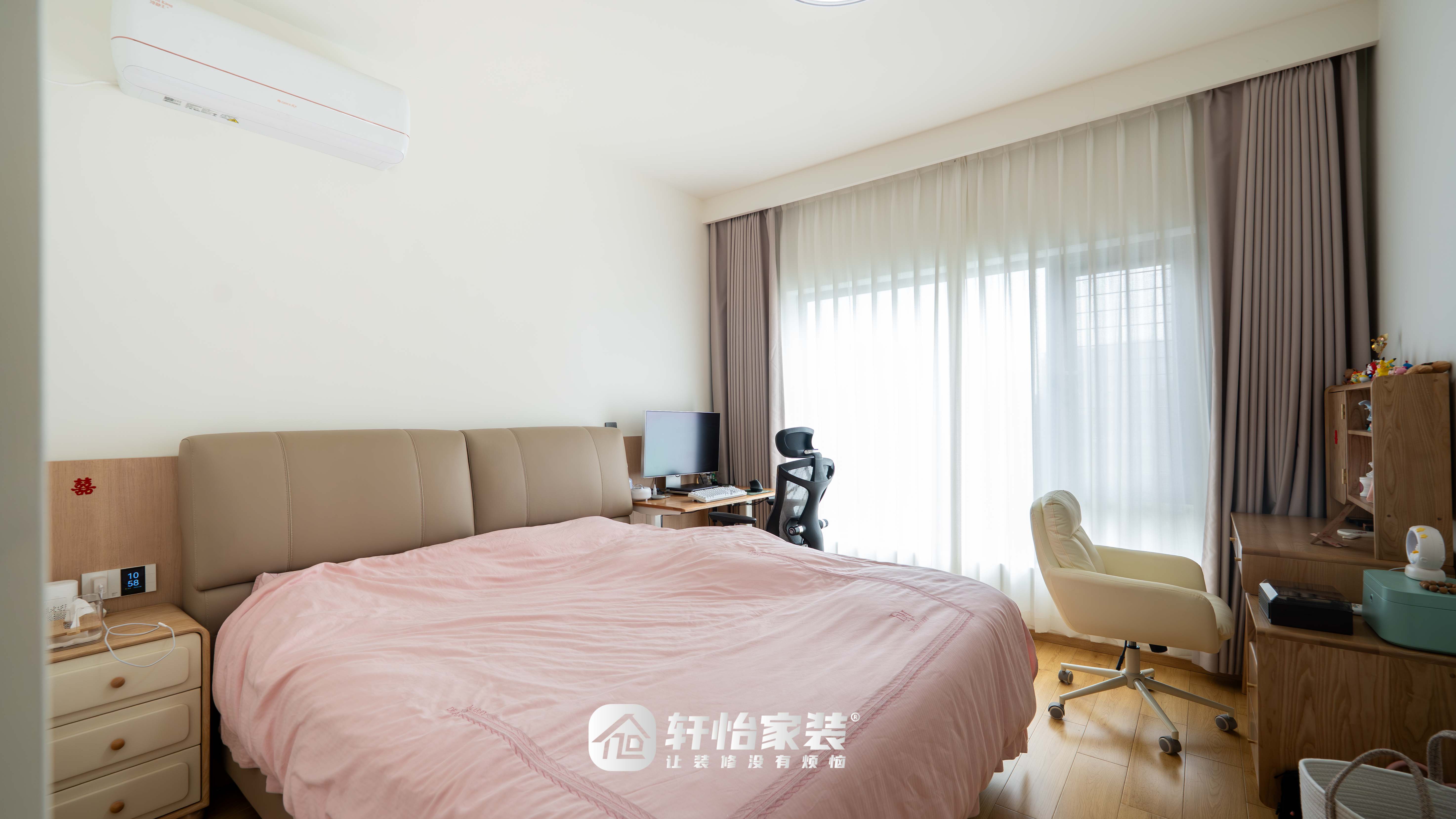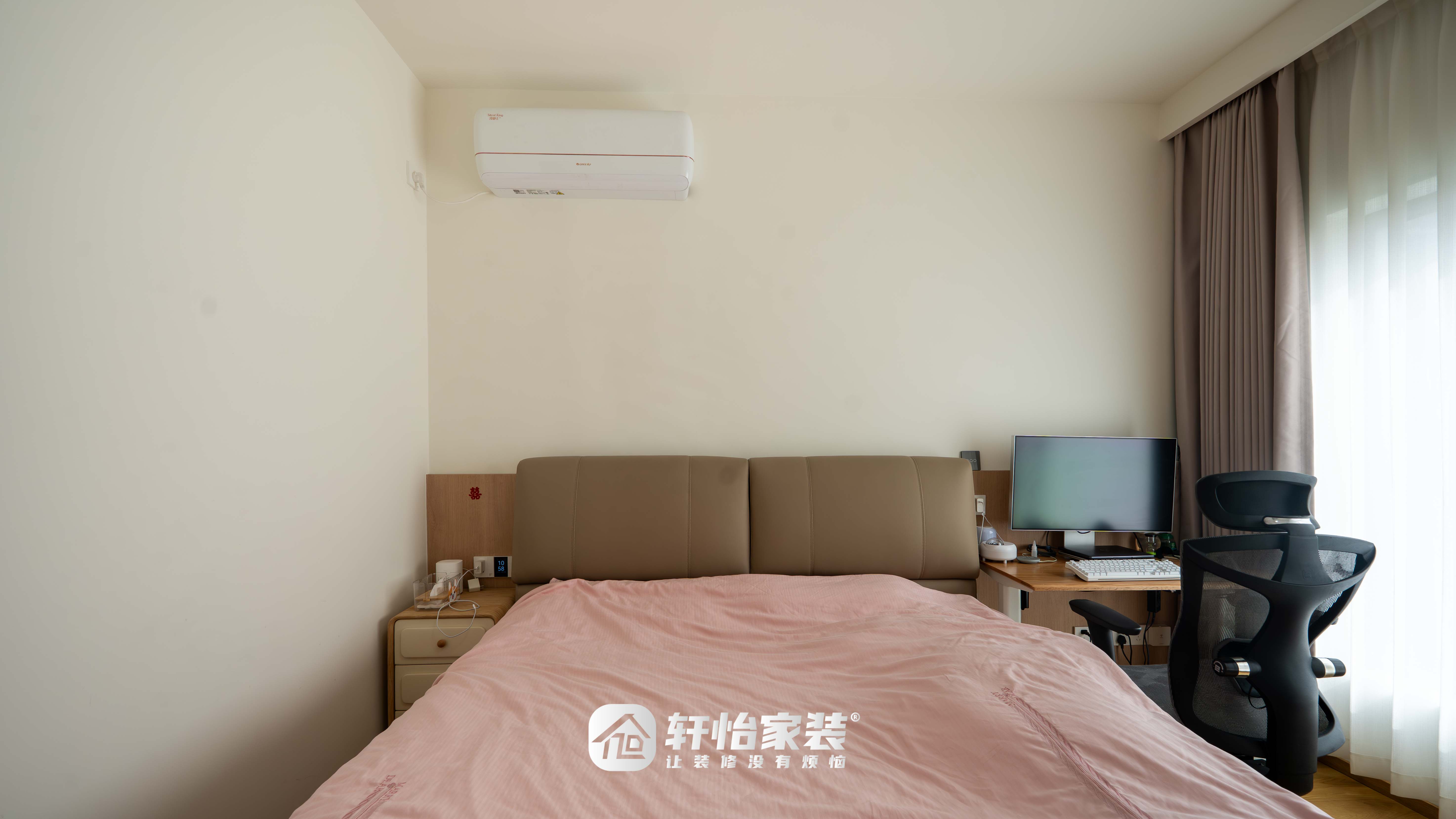 次卧风格简洁大方,浅棕色软包床头温润耐看,墙面无多余装饰,整体空间干净通透、静谧安宁。