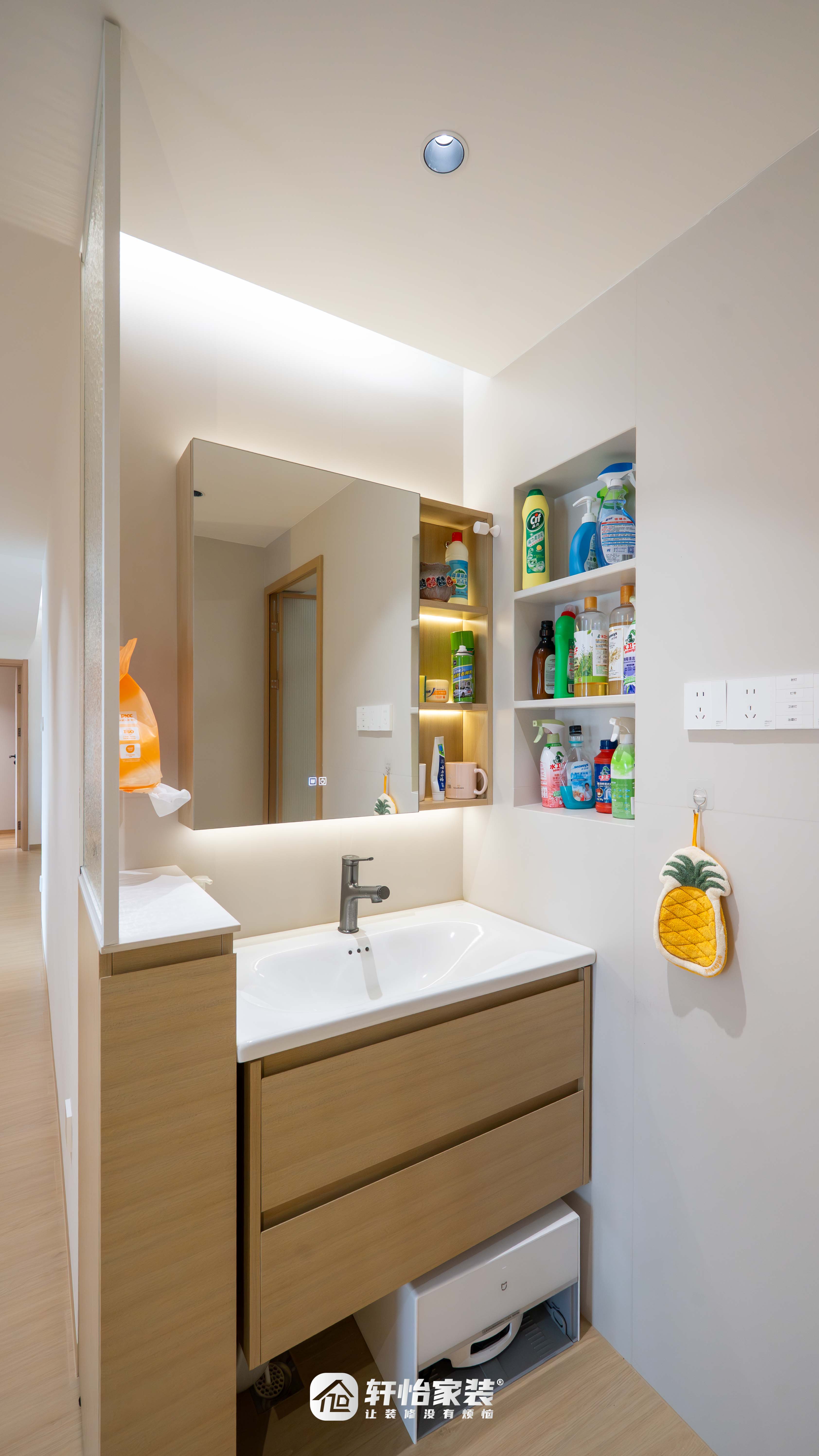 墙面延伸出一体化梳妆台,嵌入式镜子搭配开放格,护肤品、化妆品都能井然有序收纳,晨起梳妆也能变得惬意从容;