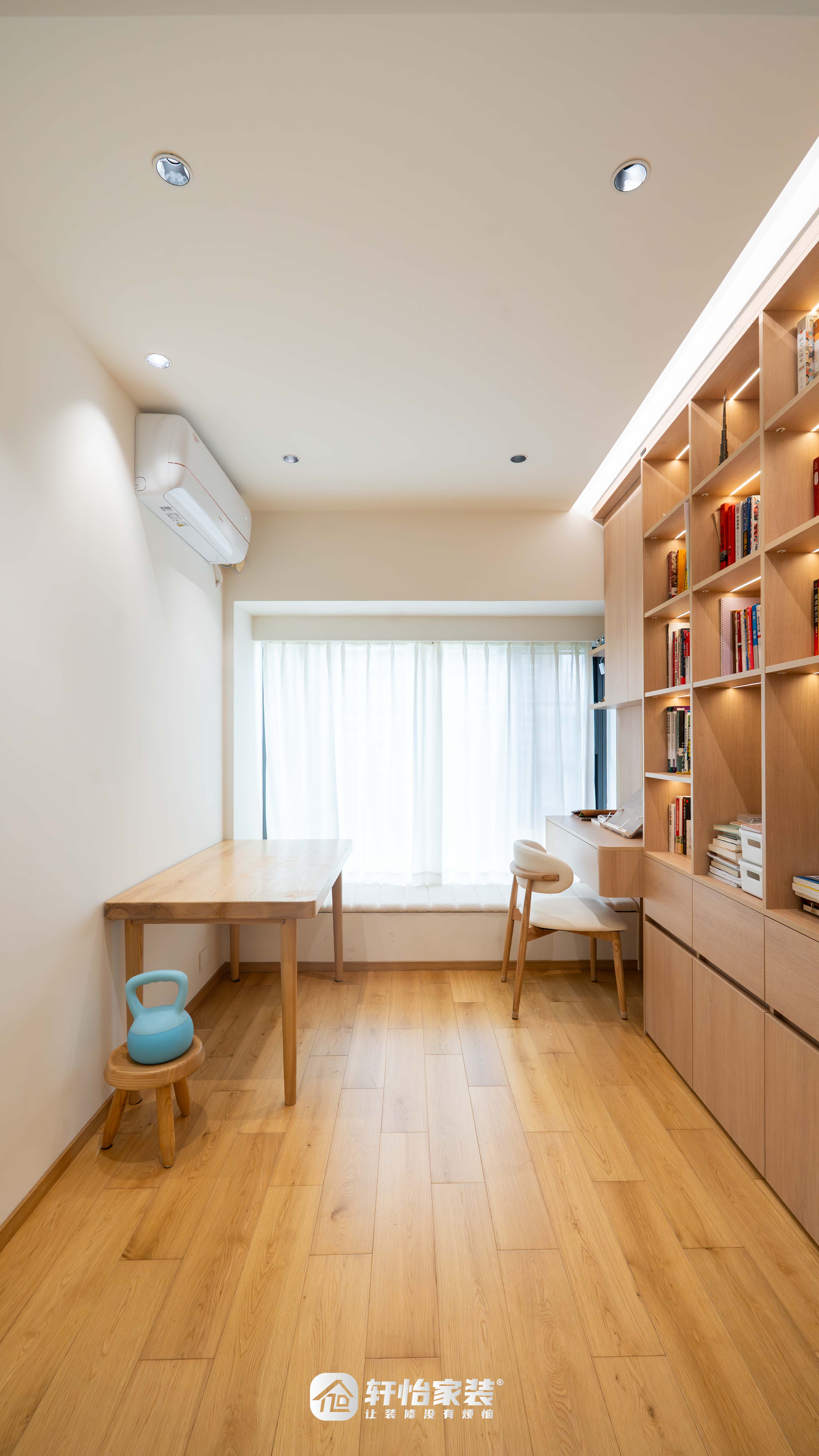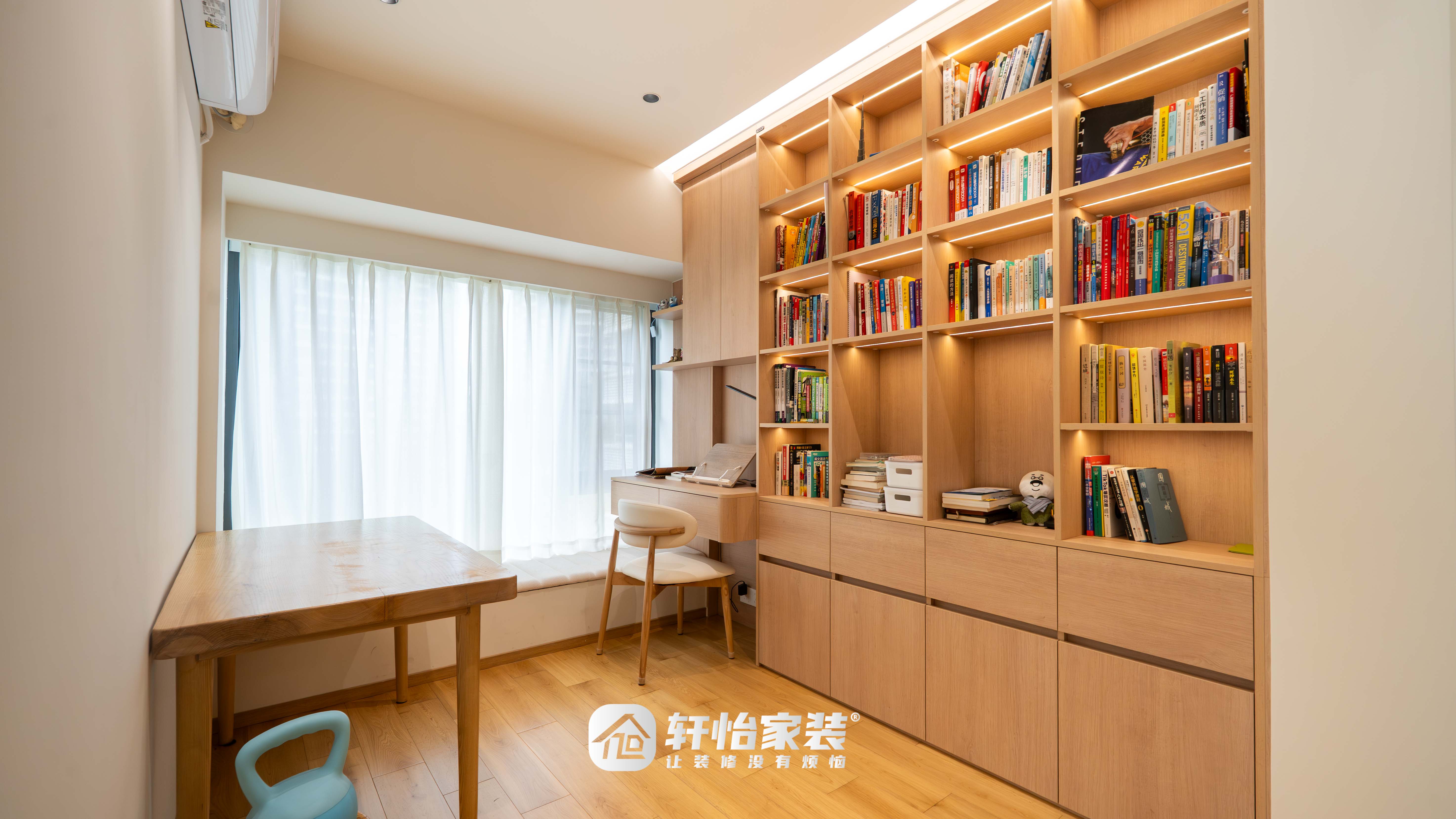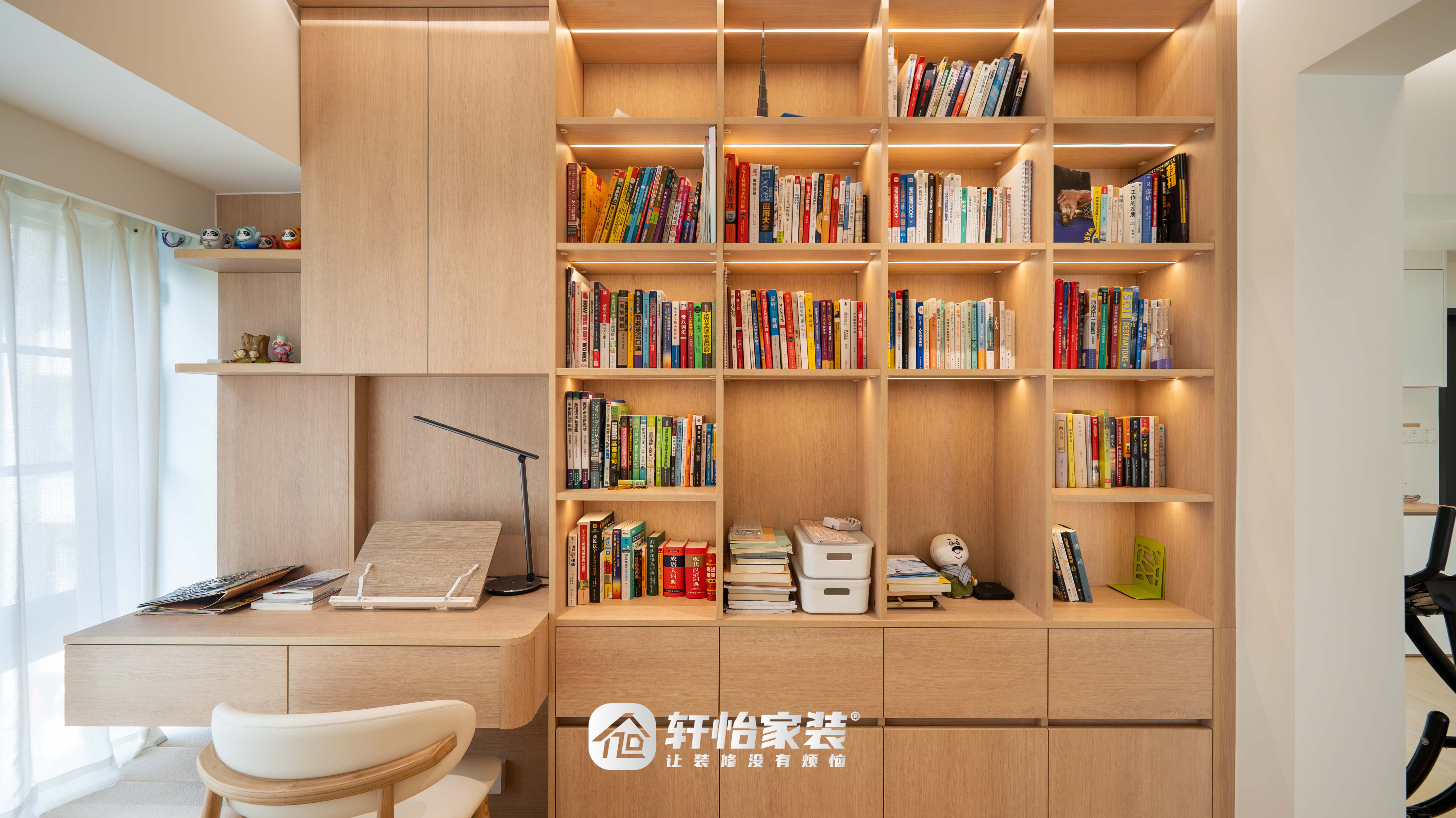 书房整体静谧雅致,推门而入,整面墙的定制书柜便映入眼帘。开放格与封闭柜错落结合,内嵌柔和灯带,暖光轻洒在书籍与藏品之上,温润又有格调。