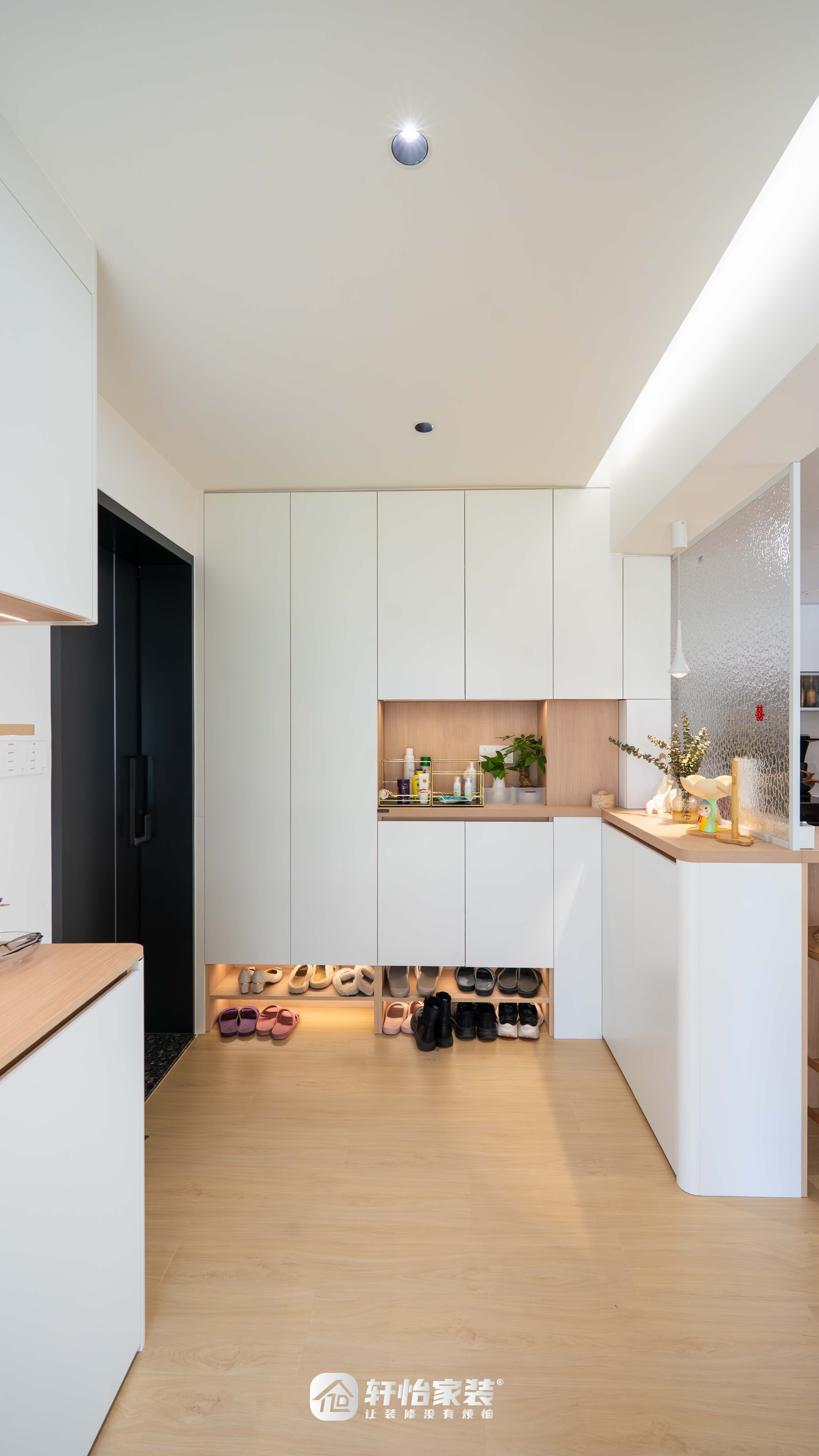 鞋柜下方刻意留空,日常换鞋无需弯腰开合,便捷又整洁;中部开放格随手摆放钥匙、香薰与小摆件,让入户的第一视角,就充满生活的小美好。