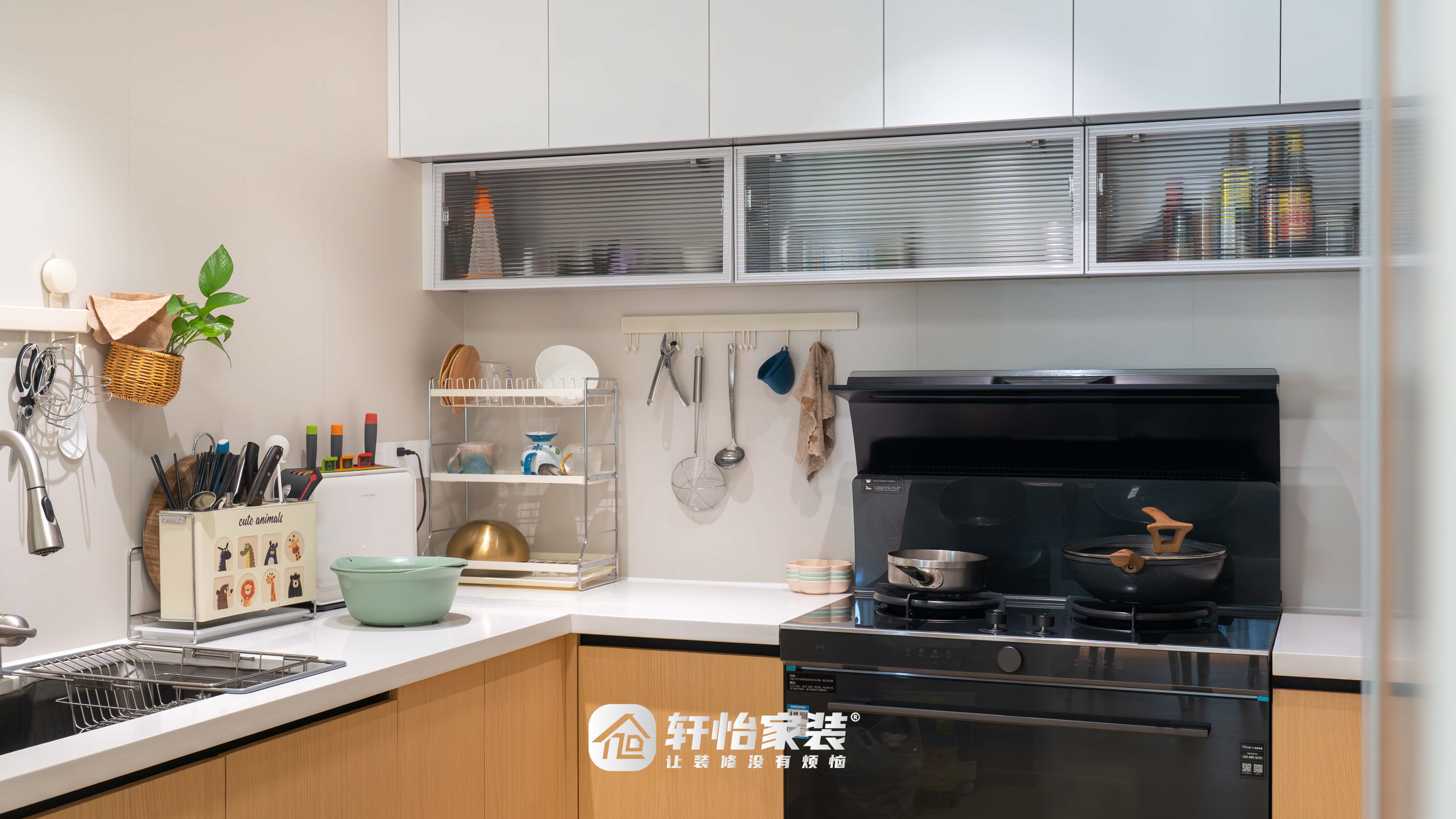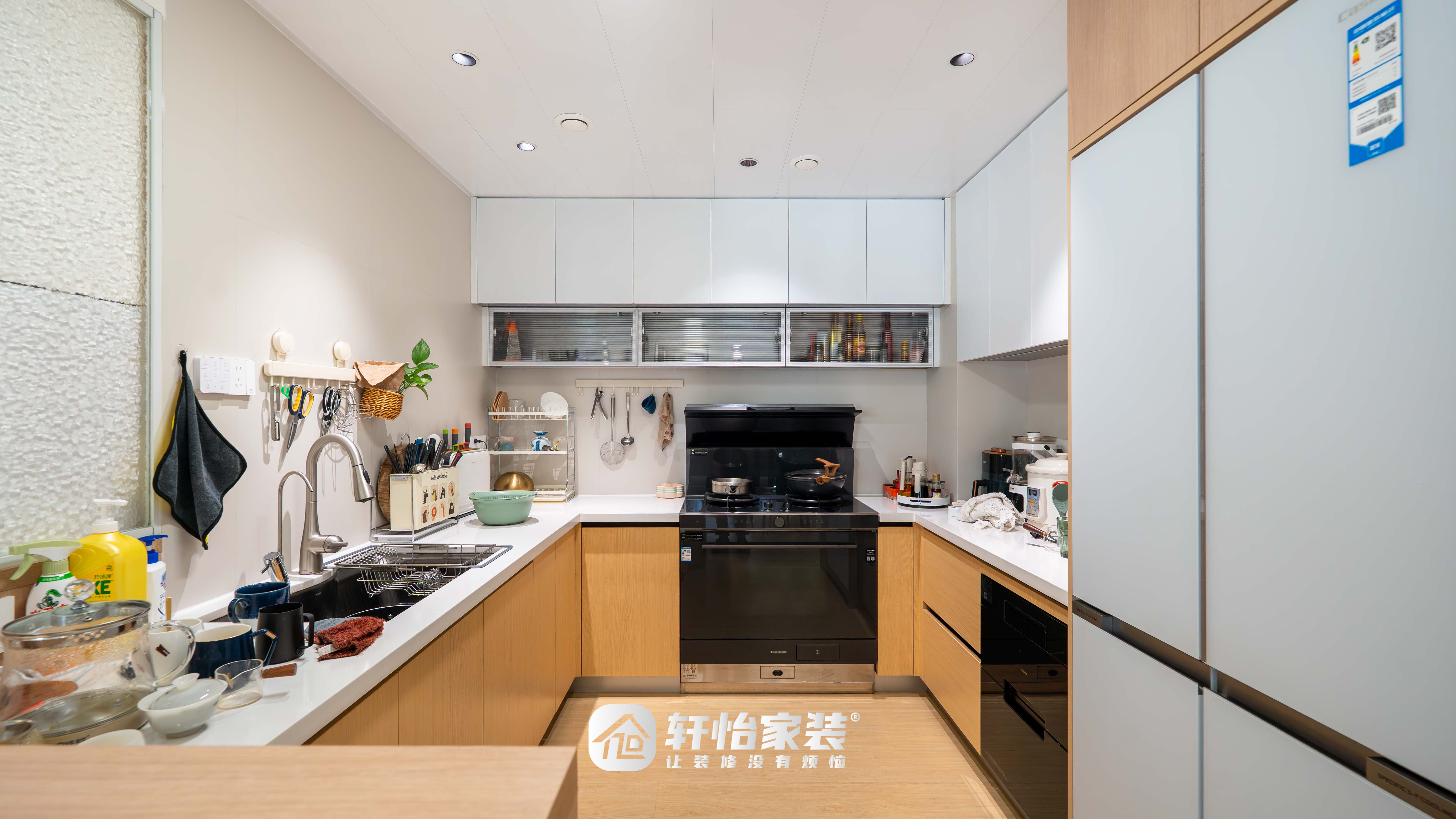 厨房井然有序,处处透着生活的烟火气。N型布局让洗、切、炒的动线流畅顺手,转身之间便能完成烹饪全流程。白色吊柜与原木地柜上下呼应,清爽中带着温暖。