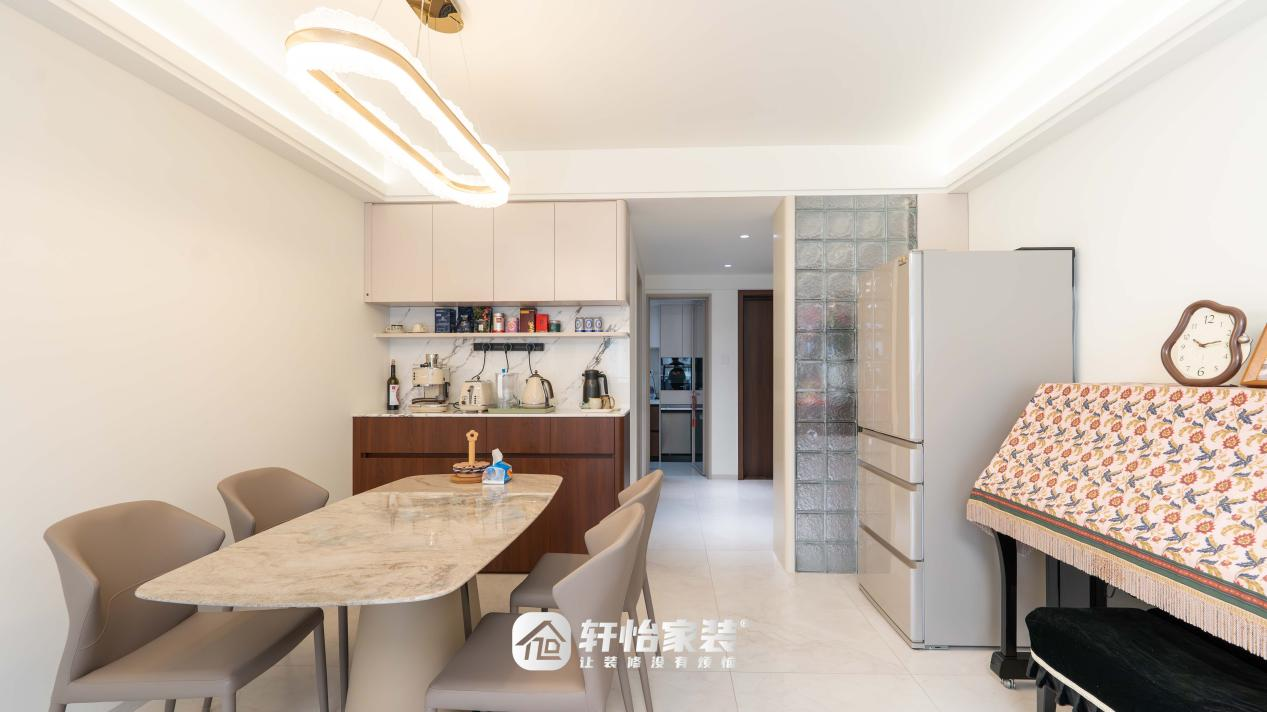 原始户型入户无遮挡、主次卧门门相对、厨房操作台面狭小。轩怡家装设计师陈晓冰增设独立玄关,用水纹玻璃半隔断柔和分区,解决了归家即见厅的尴尬,又保证了光线的穿透。