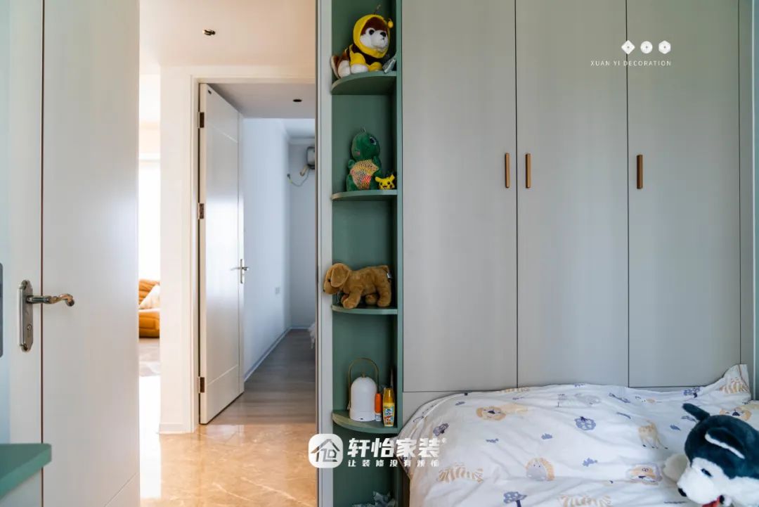 衣柜延伸出的开放格成为视野中的亮眼之笔,收纳毛绒玩偶,柔和了场域气质。