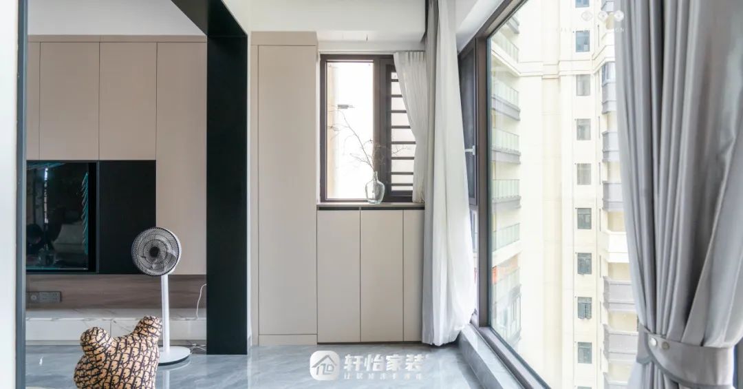 生活阳台则保留了实用功能,利用凹陷做嵌入式处理,洗衣机、洗漱台、收纳柜三重组合,满足了日常的清洁需求。餐边柜整面到顶,造型精致且色彩和谐。左侧预留的藏酒柜采用透明玻璃设计,美酒与灯带相互映衬,营造出优雅而浪漫的氛围。
