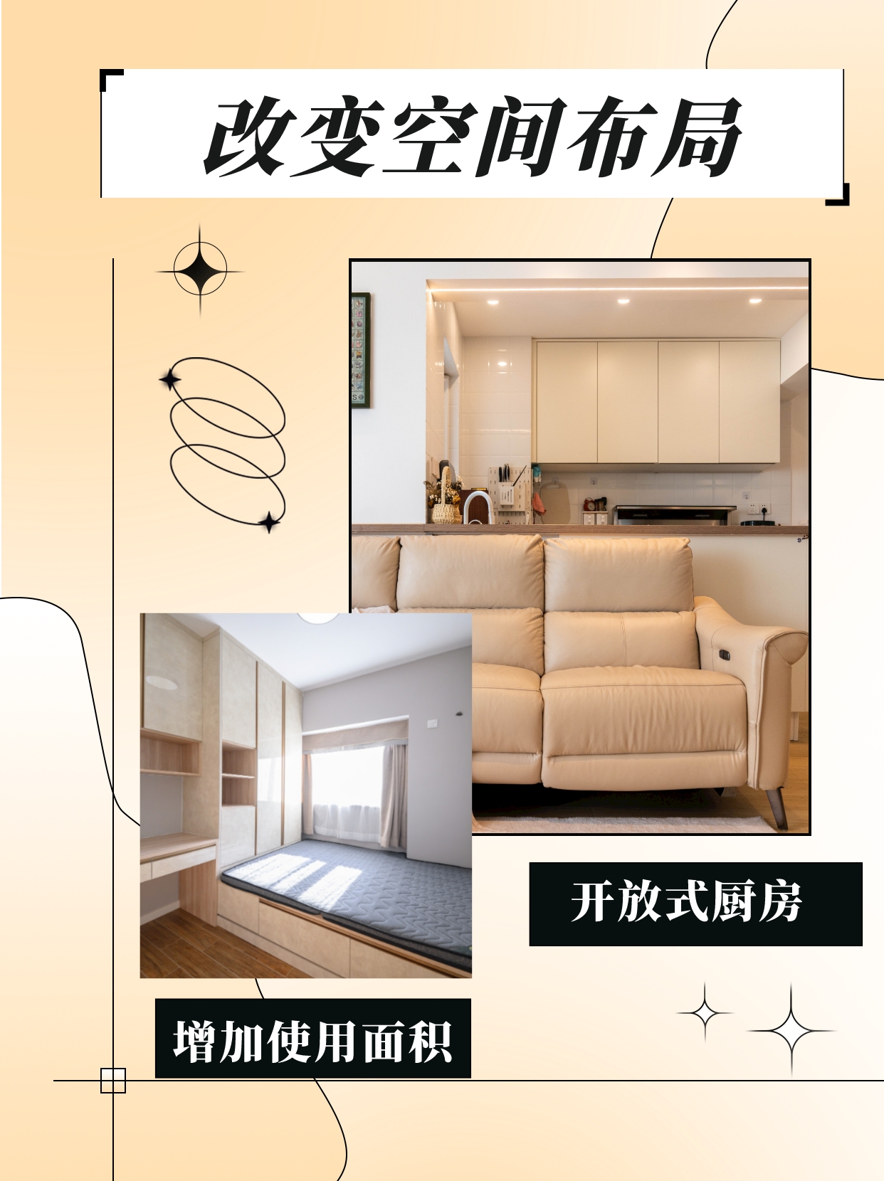 比如客厅的采光很好,但是厨房旁边的门的采光很差,所以厨房和客厅的墙没有进行拆除,形成一个开放式的厨房,那么厨房可以借用客厅的灯光来增强整体采光效果。