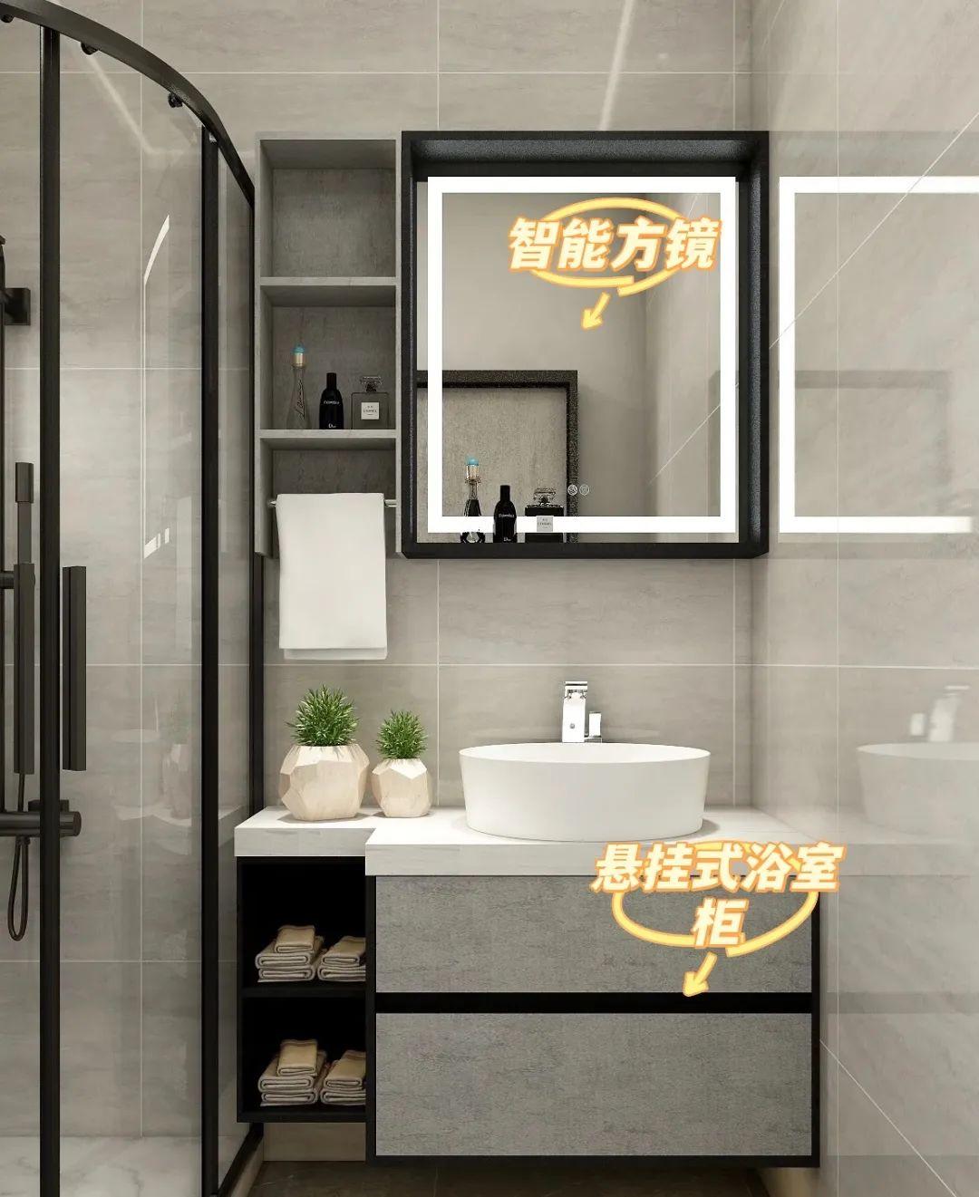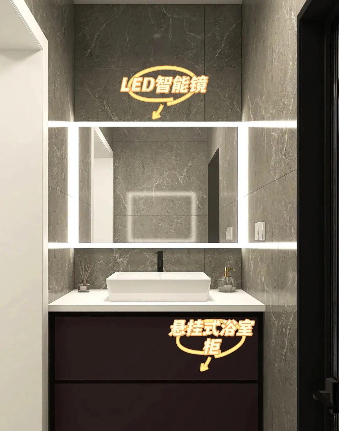 LED智能镜的安装,方便日常使用,照镜子时更清晰明了。悬挂式的浴室柜,让底部清洁更便利。