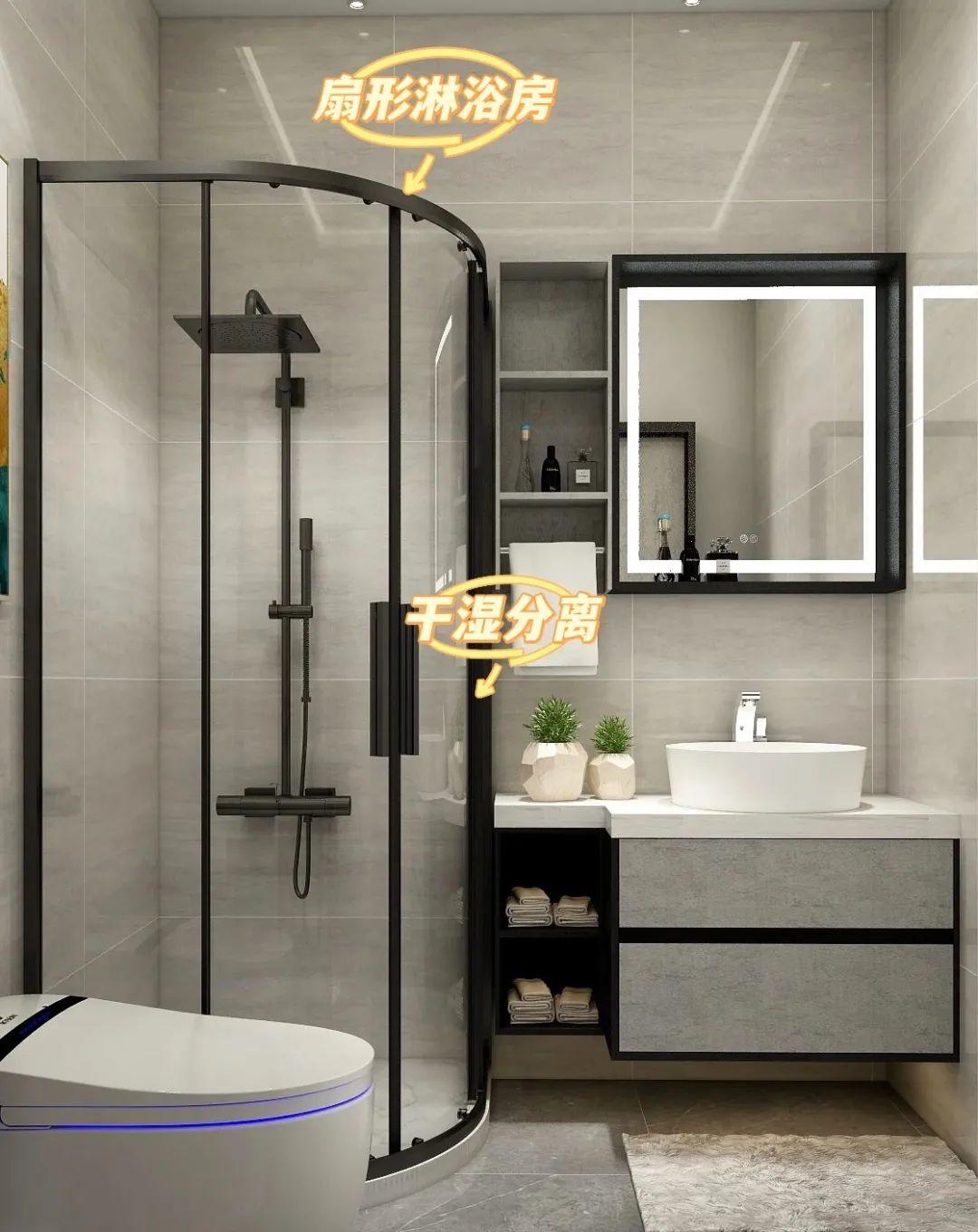 小空间为了把空间更好的利用,淋浴房做成扇形的设计,把洗漱区跟智能马桶分在两侧,把干湿分离做到彻底,同时还更好的节省了空间的活动位置。